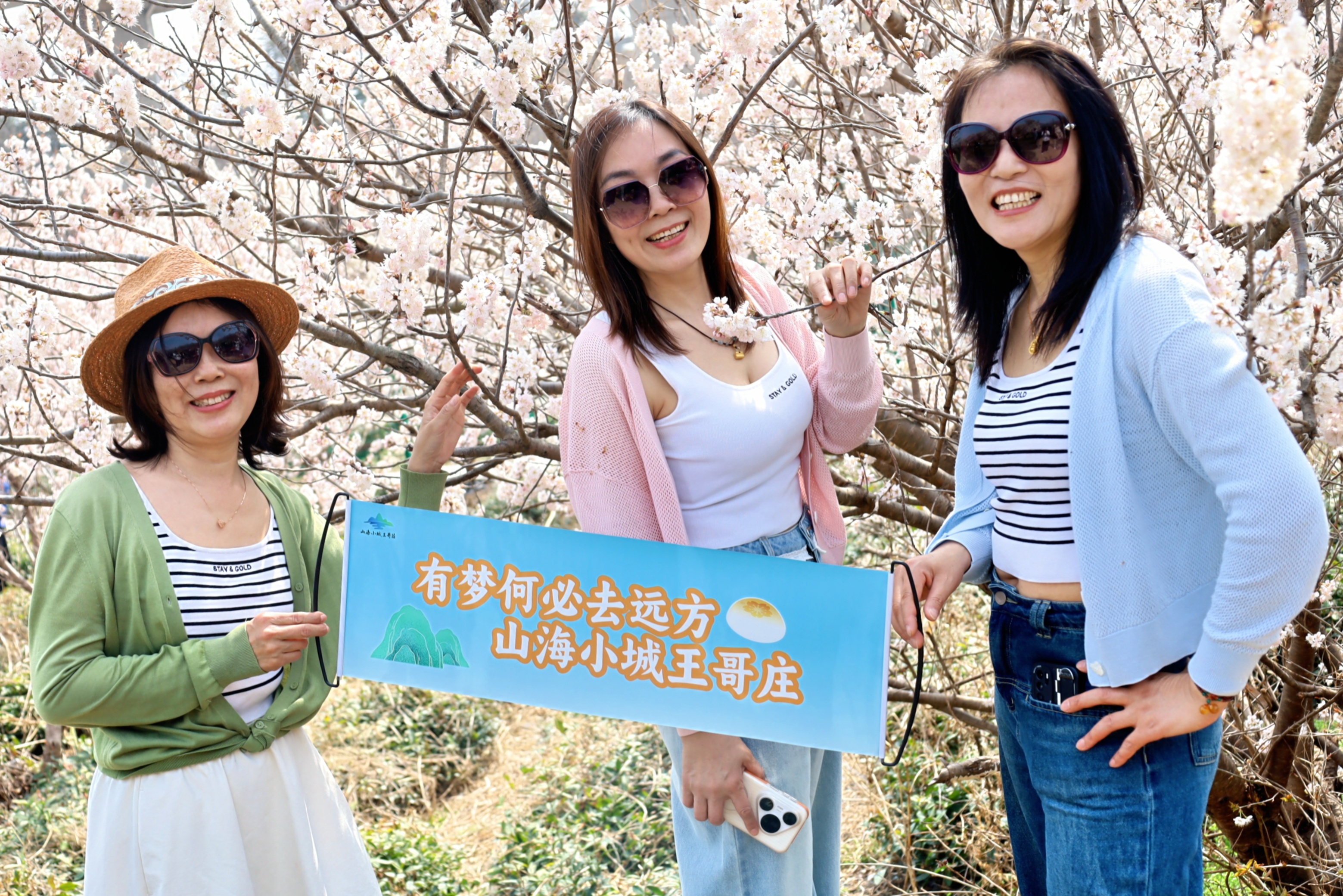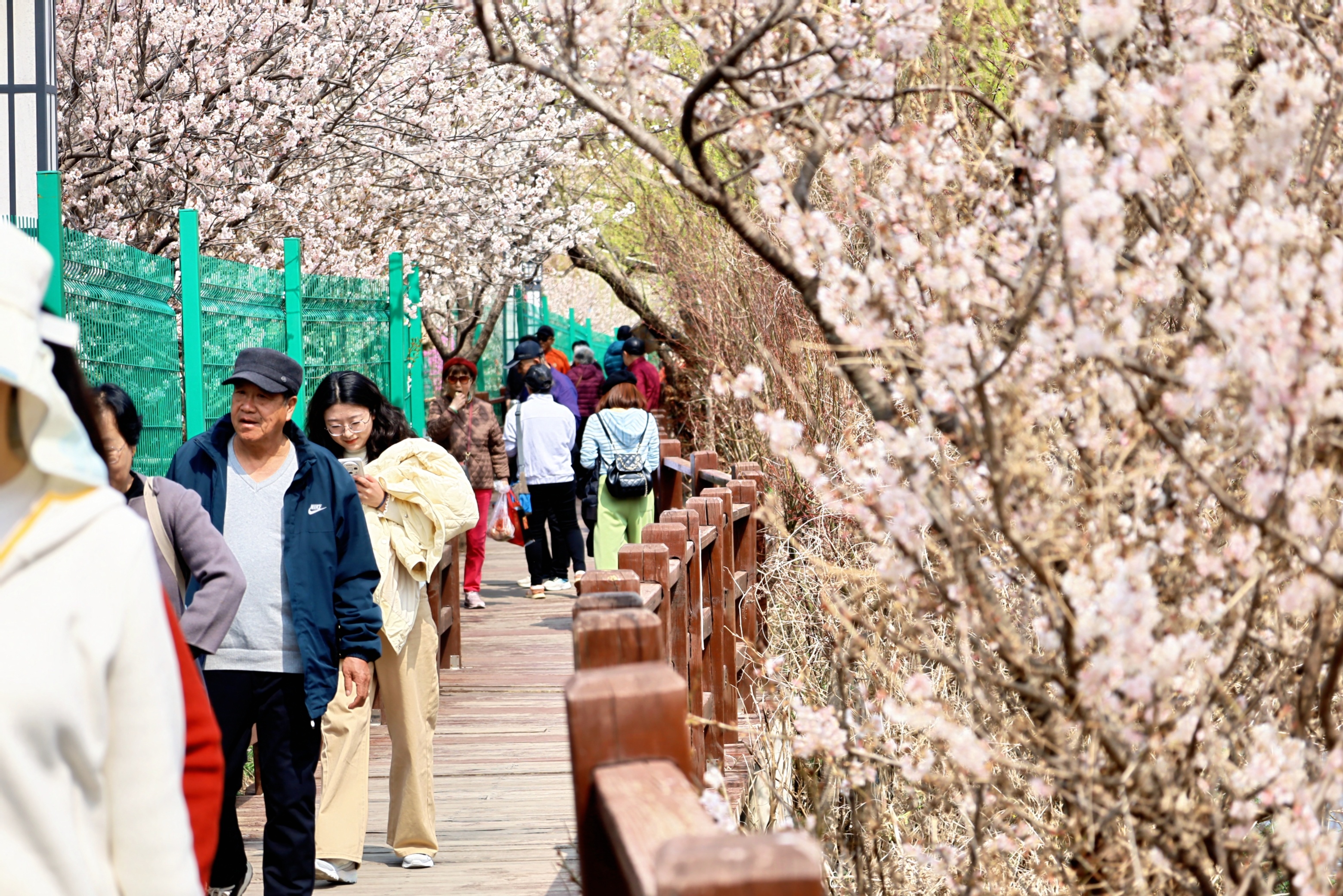 春和景明,繁花似锦。上午八点左右,青岛市崂山区王哥庄街道庙石村木栈道已经热闹了起来。来自市北区的丁女士和闺蜜刚刚走出蓝谷快线庙石站出站口,便一头扎进了漫山遍野的粉白花海。沿着黄色木栈道拾级而上,樱桃花沁人花香扑面而来。“这里的花好、山美、水美,来了就不想走。”丁女士一边用手机定格春日盛景,一边感慨。