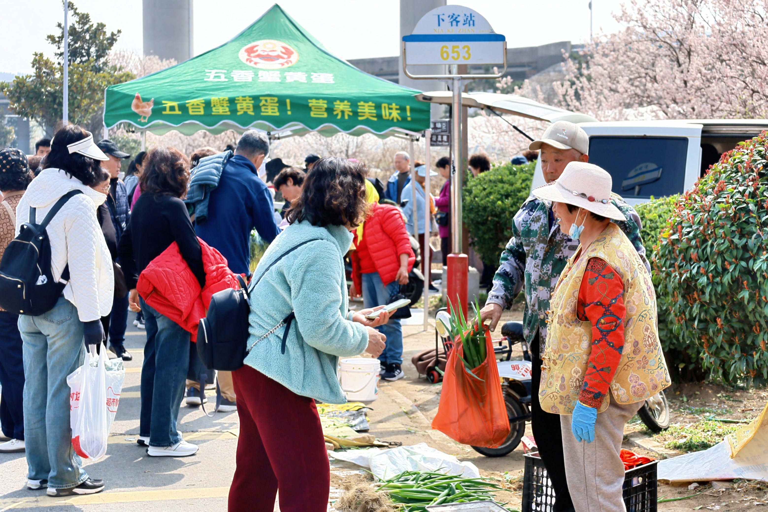 人流带来了商机。走出蓝谷快线庙石站,路边摆满了村民自发设立的小摊,新鲜蔬菜、崂山茶叶、甜晒鱼、王哥庄大馒头等特色土特产整齐摆放,游客赏完花返程时,几乎人人都提着满满当当的“伴手礼”,将庙石的春日味道带回家。“我们村主要种植茶叶,去年开始,村民们在茶田空闲位置种上大葱,今年正好收获上市,很受游客欢迎。”庙石村村委委员高圆圆笑着说,一个小小的摊位,一天就能有300多元的营业额,看似不起眼,却成为村民增收的“微阵地”,让大家在家门口就能赚到钱。