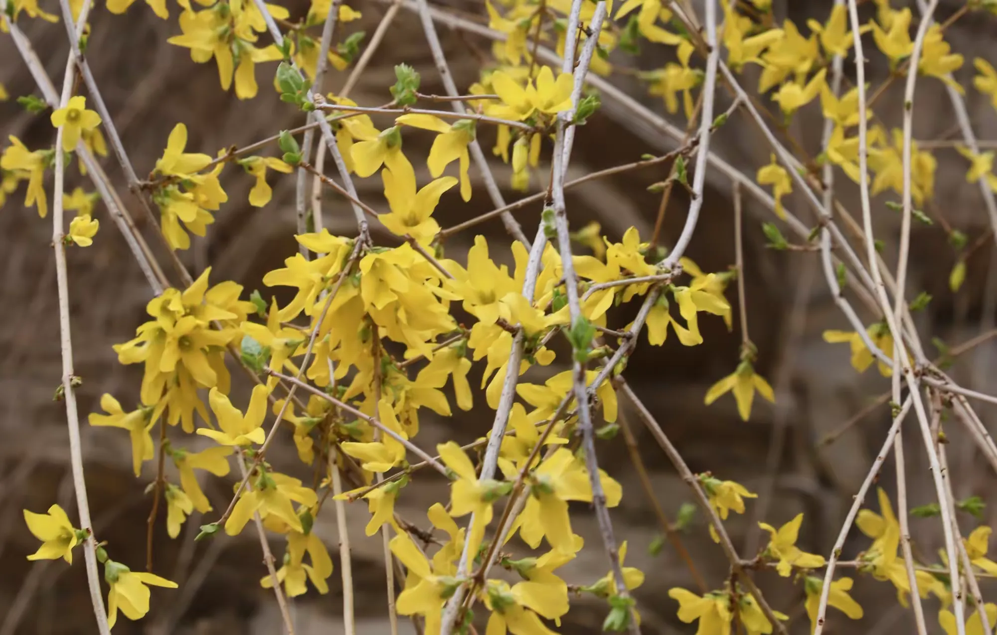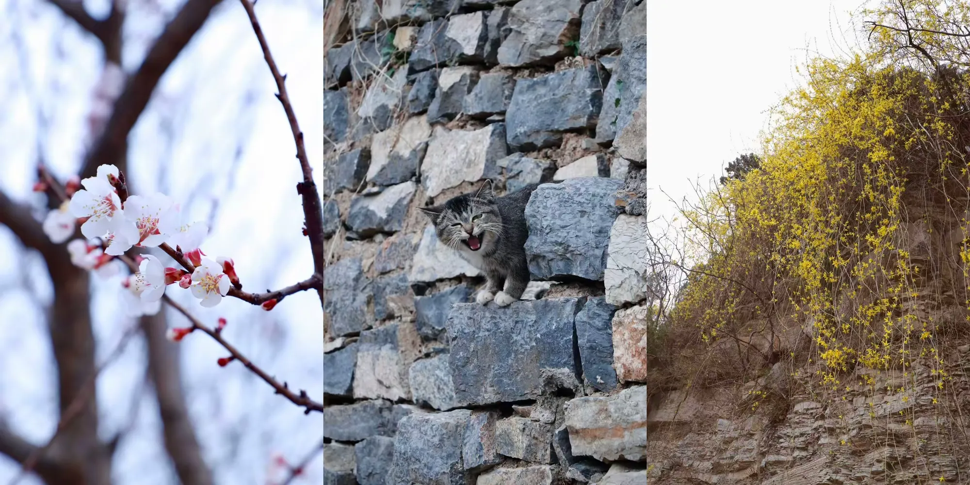 不同于公园里的精致,这里的花开得野趣十足。家家户户的石头院墙边,金黄的连翘探出头来,田间地头,粉白的杏花、桃花点缀在层层梯田之上。