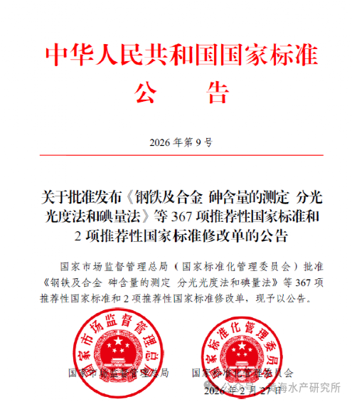 近日,根据国家市场监督管理总局(国家标准化管理委员会)发布的2026年国家标准批准发布公告(2026年第9号),由中国水产科学研究院黄海水产研究所主持修订的《中国对虾 亲虾和苗种》《海带 种藻和苗种》《三疣梭子蟹》《黑鲷 亲鱼和苗种》《栉孔扇贝 亲贝和苗种》等5项国家标准正式获批发布。