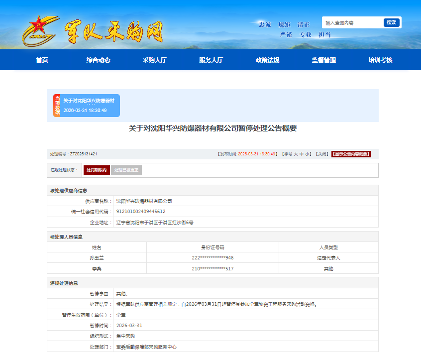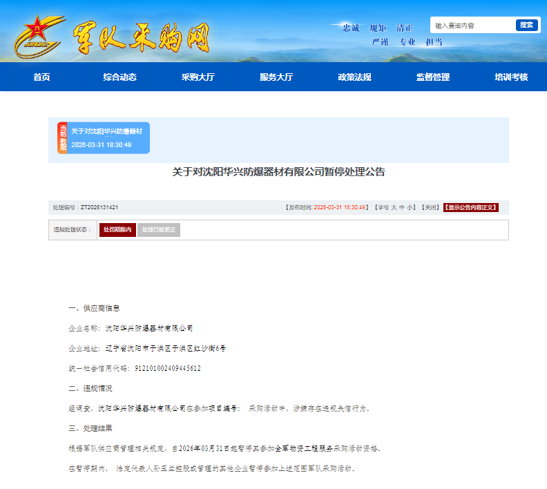 据悉,处理部门根据军队供应商管理相关规定,自2026年3月31日起暂停其参加全军物资工程服务采购活动资格。在暂停期内,其法定代表人孙玉兰控股或管理的其他企业暂停参加上述范围军队采购活动。处理编号:ZT2026131421。违规处理状态:处罚期限内。