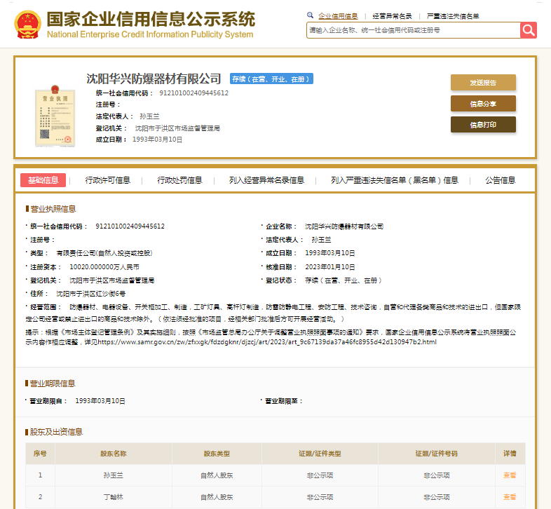 国家企业信用信息公示系统显示,沈阳华兴防爆器材有限公司成立于1993年,法定代表人孙玉兰,注册资本10020万元人民币。