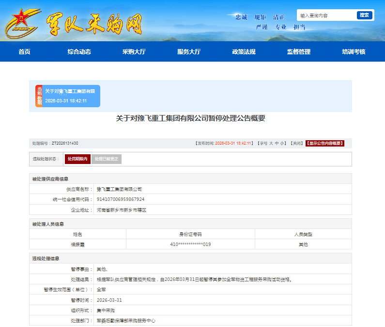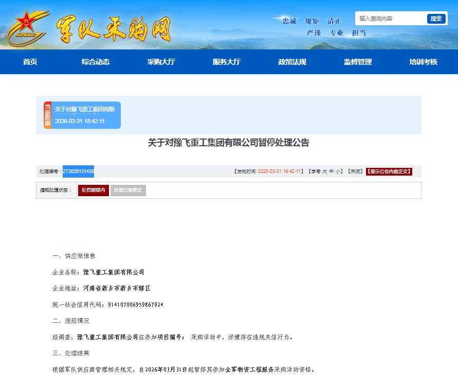 据悉,处理部门根据军队供应商管理相关规定,自2026年3月31日起暂停其参加全军物资工程服务采购活动资格。处理编号:ZT2026131430。违规处理状态:处罚期限内。