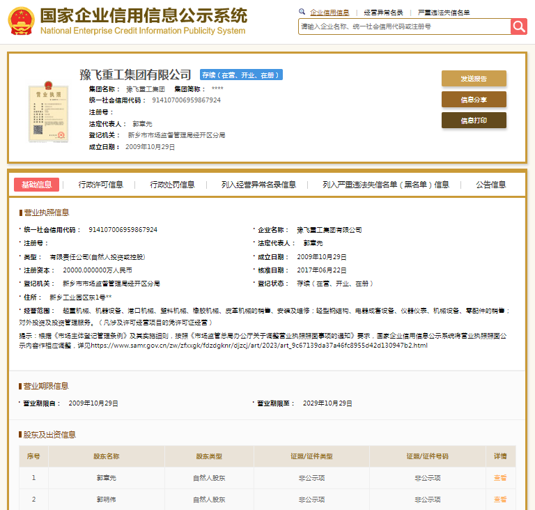 国家企业信用信息公示系统显示,豫飞重工集团有限公司成立于2009年,法定代表人郭章先,注册资本20000万元人民币。