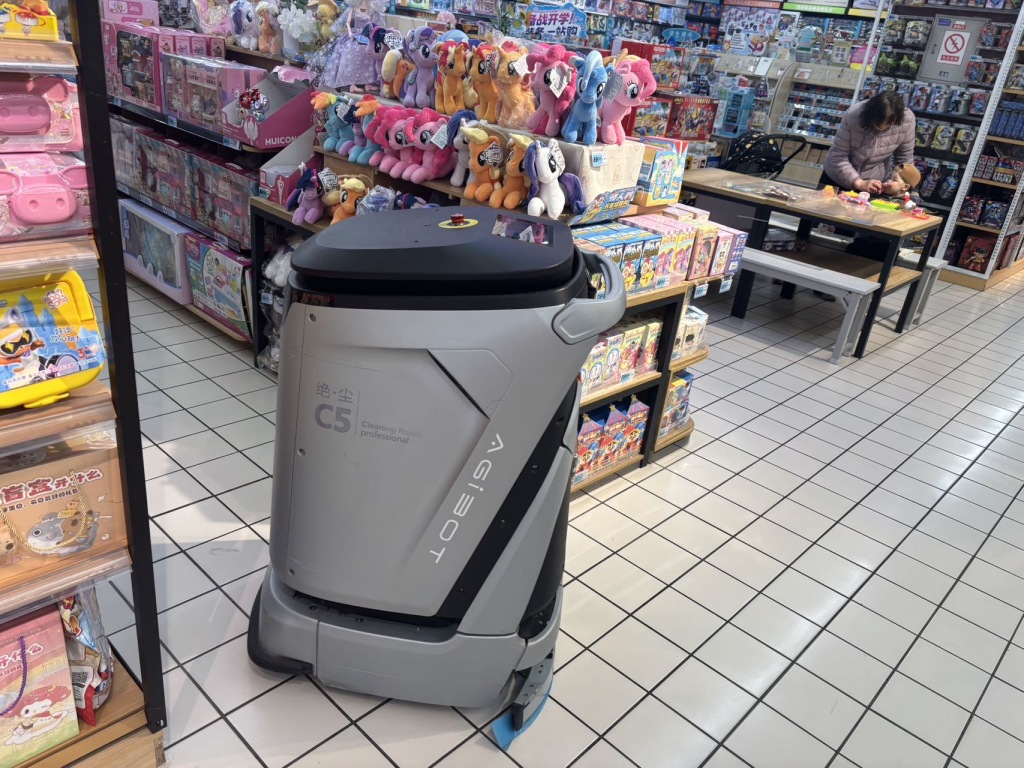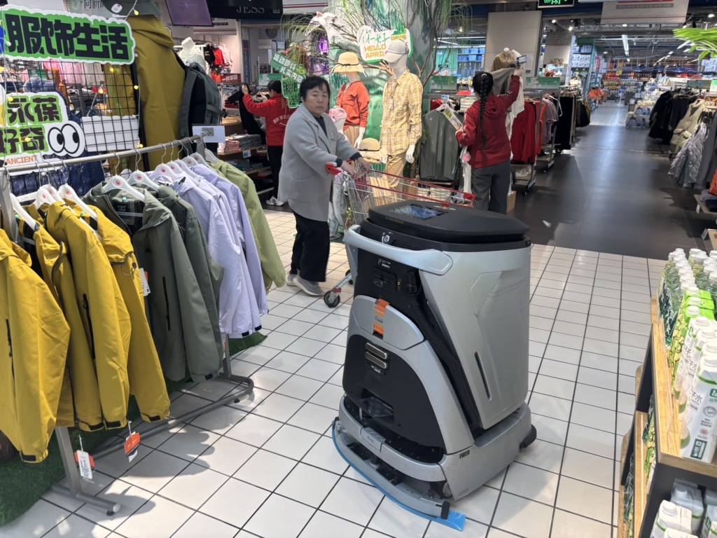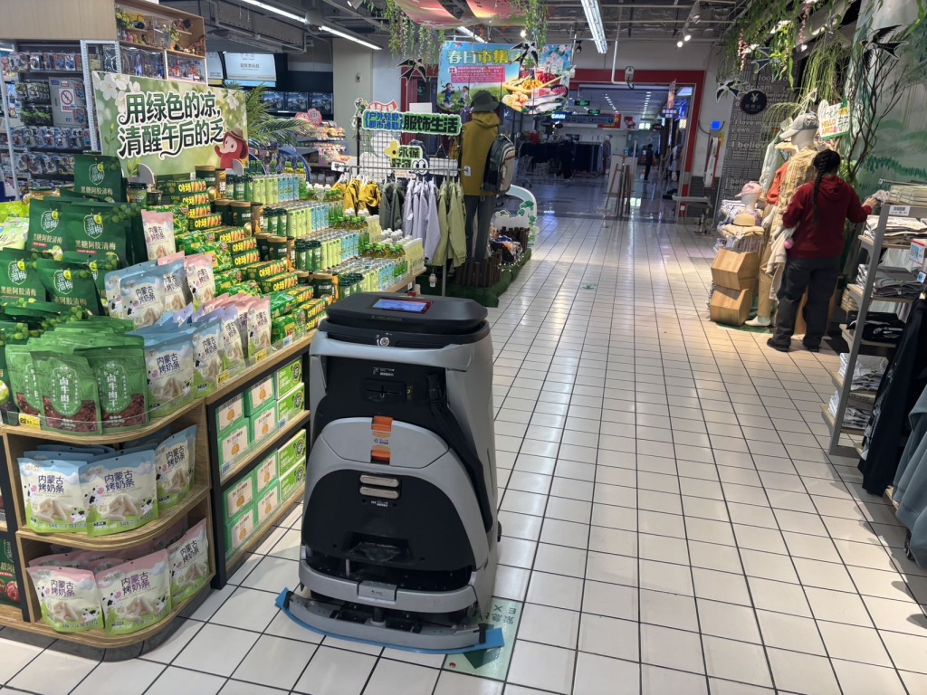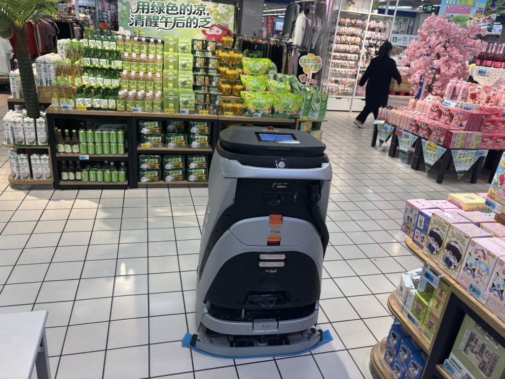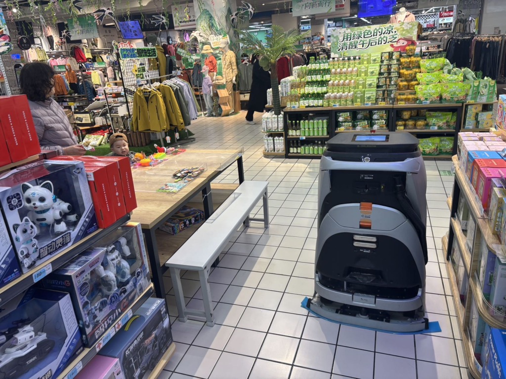 4月1日,青岛浮山后一家大商超内,保洁机器人在运行工作。它取代了以往的人工清扫模式,在清理工作完成后会自行到充电桩位置续航充电。据工作人员介绍,该款保洁设备已经运行一段时间,只进行表面处理,一些小角落还要通过人工清理。(半岛全媒体记者何毅)