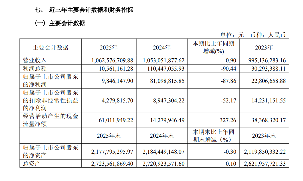虽然易主省属国资委,但是两面针的业绩仍值得市场关注。根据公司2025年年报,去年两面针实现归母净利润984.61万元,同比大幅下滑87.8%;基本每股收益仅0.0179元,较2024年的0.1475元大幅缩水。尽管公司2025年营业收入微增至10.63亿元,但营业利润仅783.67万元,盈利能力持续弱化。
