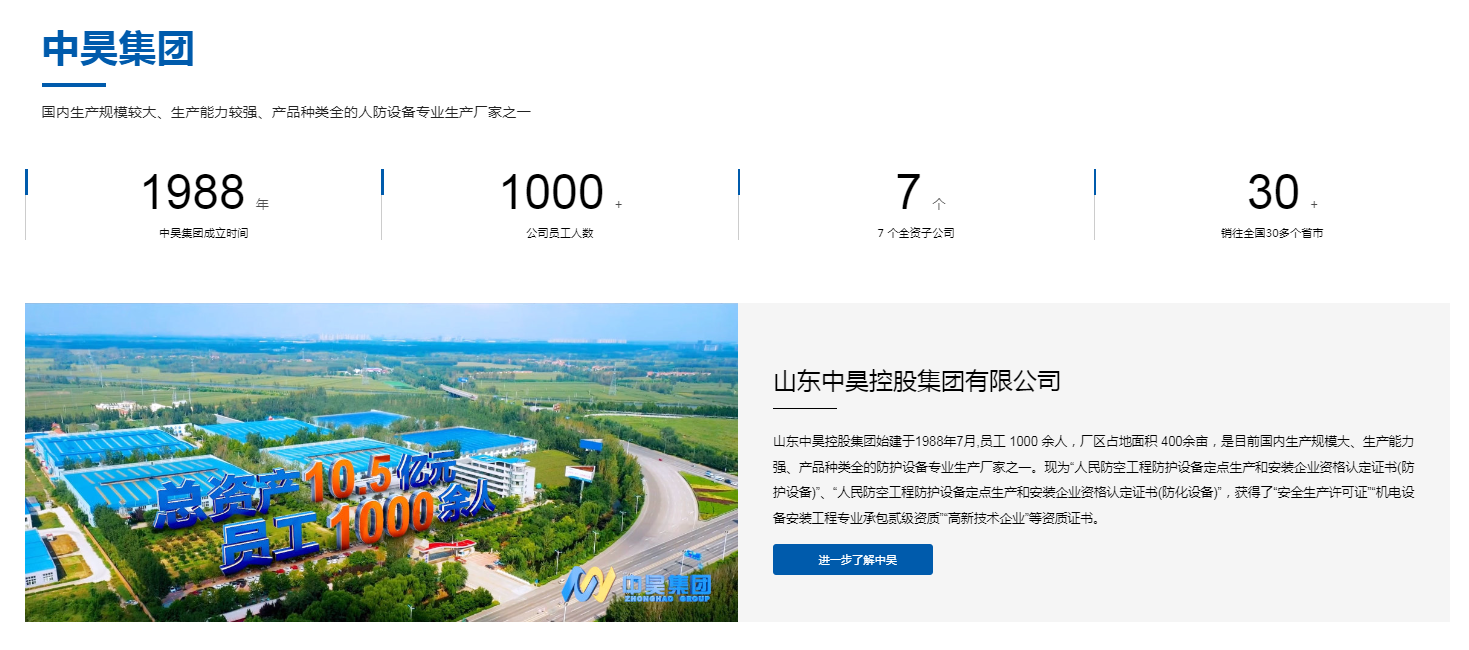 山东中昊控股官网介绍,公司是目前国内生产规模大、生产能力强、产品种类全的防护设备专业生产厂家之一。主打产品为“中昊”牌人防(国防)工程防护设备、“巨龙”牌防化设备和战时通风设备、核电设备。现具备生产防护设备78500台/套、过滤吸收器30000台、战时通风设备37800台/套及特种专用设备10000台/套的生产能力。