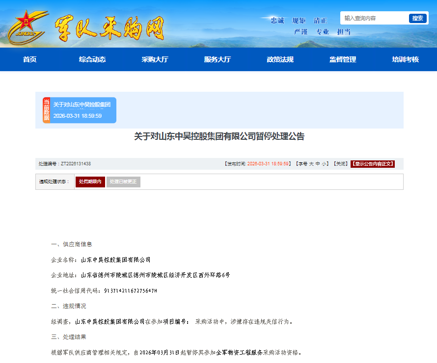据悉,处理部门根据军队供应商管理相关规定,自2026年3月31日起暂停其参加全军物资工程服务采购活动资格。处理编号:ZT2026131438。违规处理状态:处罚期限内。
