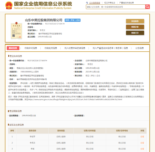 国家企业信用信息公示系统显示,山东中昊控股集团有限公司成立于1995年,法定代表人李秀文,注册资本7000万元人民币。