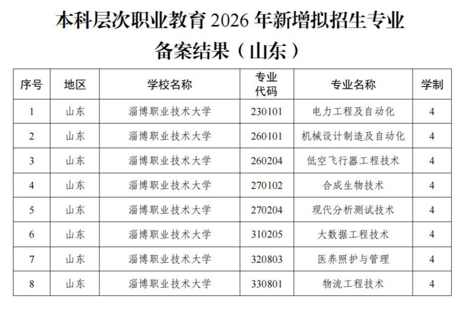 近日,教育部办公厅公布2026年本科层次职业教育专业设置备案结果,淄博职业技术大学申报的电力工程及自动化、机械设计制造及自动化、低空飞行器工程技术、合成生物技术、现代分析测试技术、大数据工程技术、医养照护与管理、物流工程技术等8个四年制职业本科专业获批。作为山东省第一所公办本科职业院校,淄博职业技术大学四年制职业本科招生专业今年增至14个。