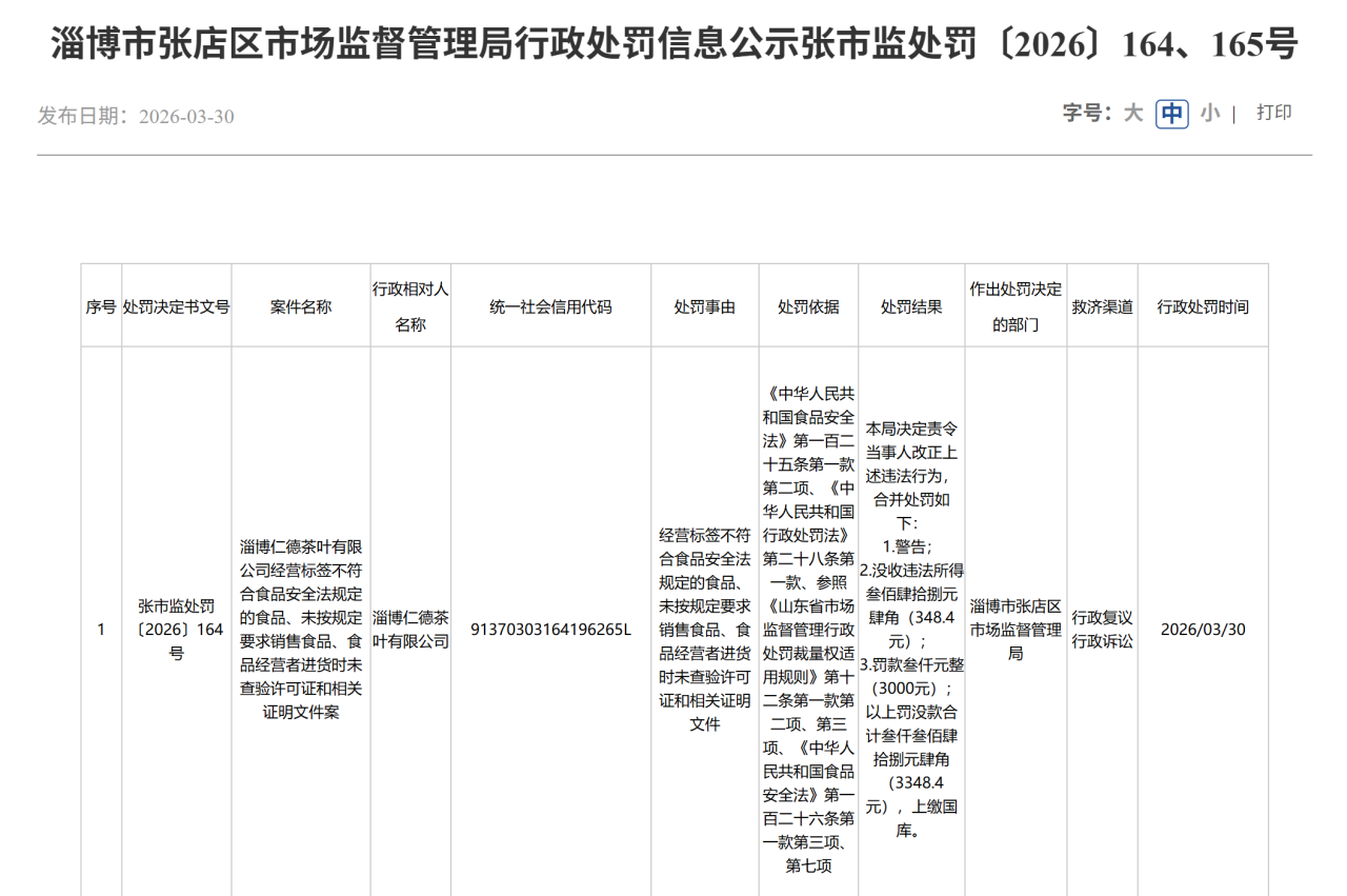 3月30日,淄博市张店区市场监督管理局发布的行政处罚信息公示显示,淄博仁德茶叶有限公司因存在多项食品安全违规行为,被依法作出警告、没收违法所得并罚款的行政处罚,罚没款合计3348.4元。