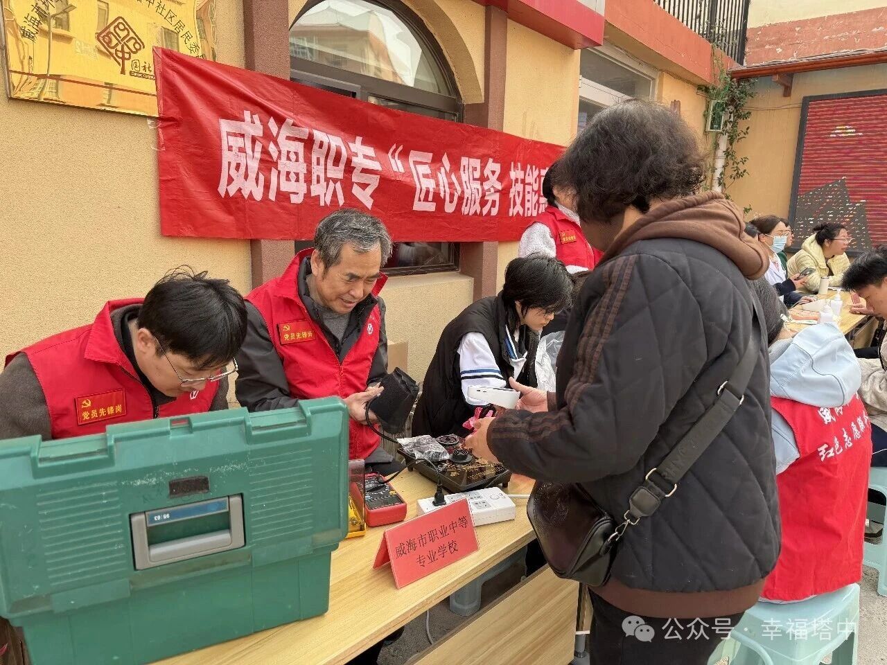 威海职业中专的志愿者们耐心接待每一位居民,细致检查、维修各类小家电,志愿者们认真排查故障、巧手维修,不仅为居民节省了维修成本,更解决了“小家电坏了无处修”的难题;活动中,威海职业中专的志愿者们还为居民开展耳穴管理公益服务,运用专业知识提供耳穴压豆、健康指导等便民服务,用实际行动传递温暖,既展现了青年学子的责任担当,也让社区居民在家门口享受到贴心的健康关怀。