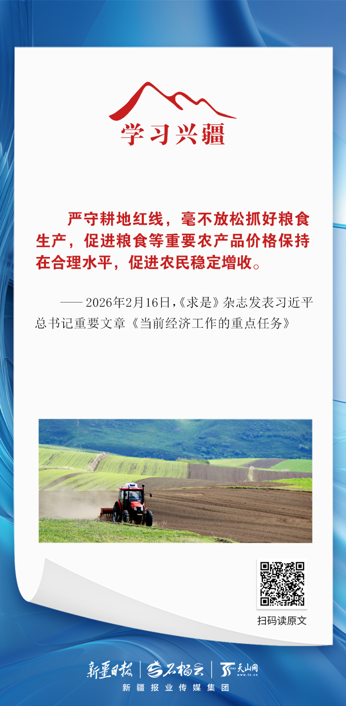 学习兴疆丨严守耕地红线,毫不放松抓好粮食生产天山网 2026-04-01 17:03:21严守耕地红线,毫不放松抓好粮食生产,促进粮食等重要农产品价格保持在合理水平,促进农民稳定增收。——2026年2月16日,《求是》杂志发表习近平总书记重要文章《当前经济工作的重点任务》责任编辑:阿依提拉·图尔荪