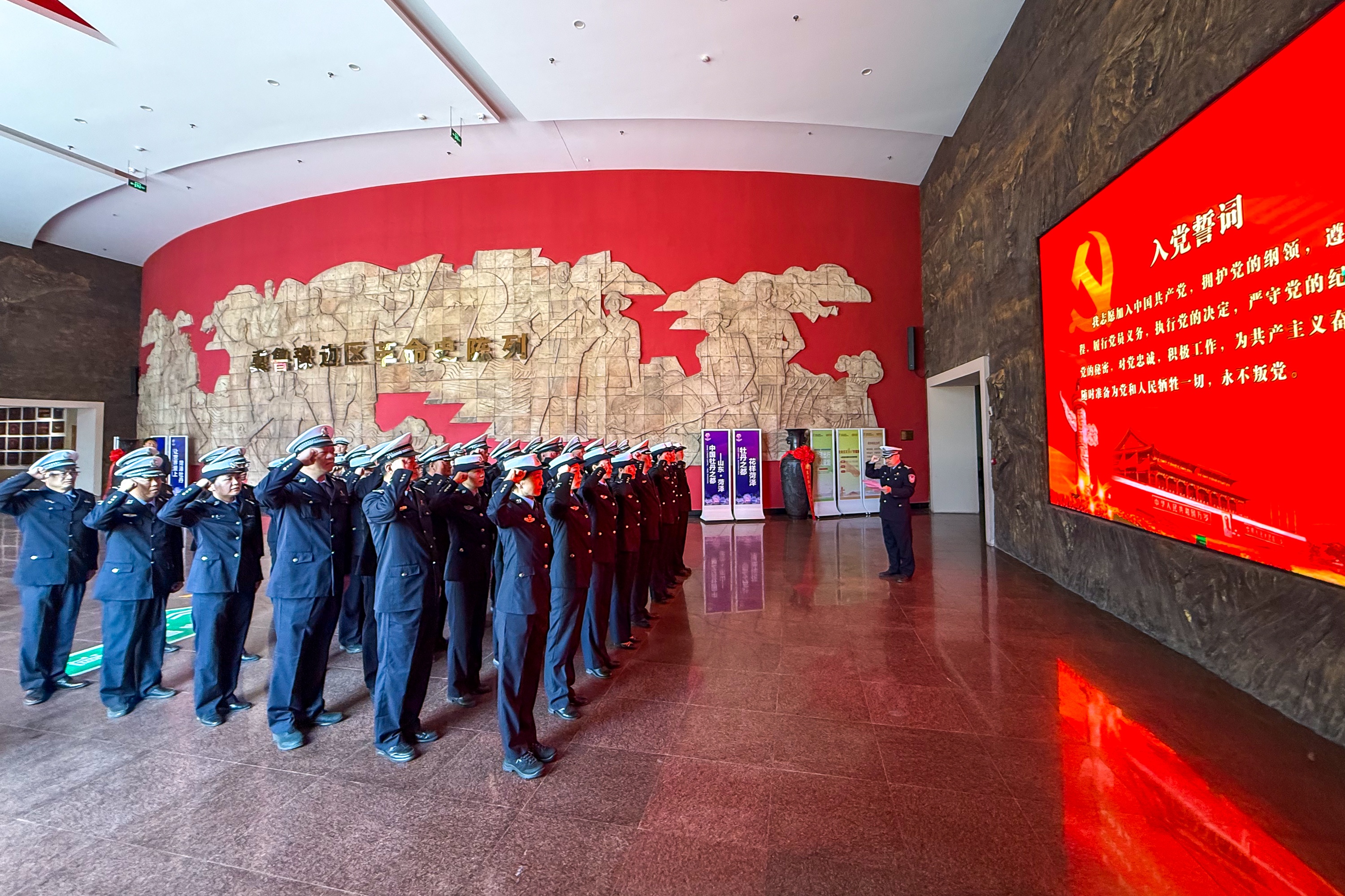 在纪念馆内,全体民辅警面向党旗庄严宣誓,重温入党誓词,铿锵有力的誓言彰显了交警队伍的忠诚与担当。随后,大家跟随讲解员参观展厅,通过历史文物、影像资料,深入学习冀鲁豫边区的革命历程,感悟革命先烈的崇高精神。