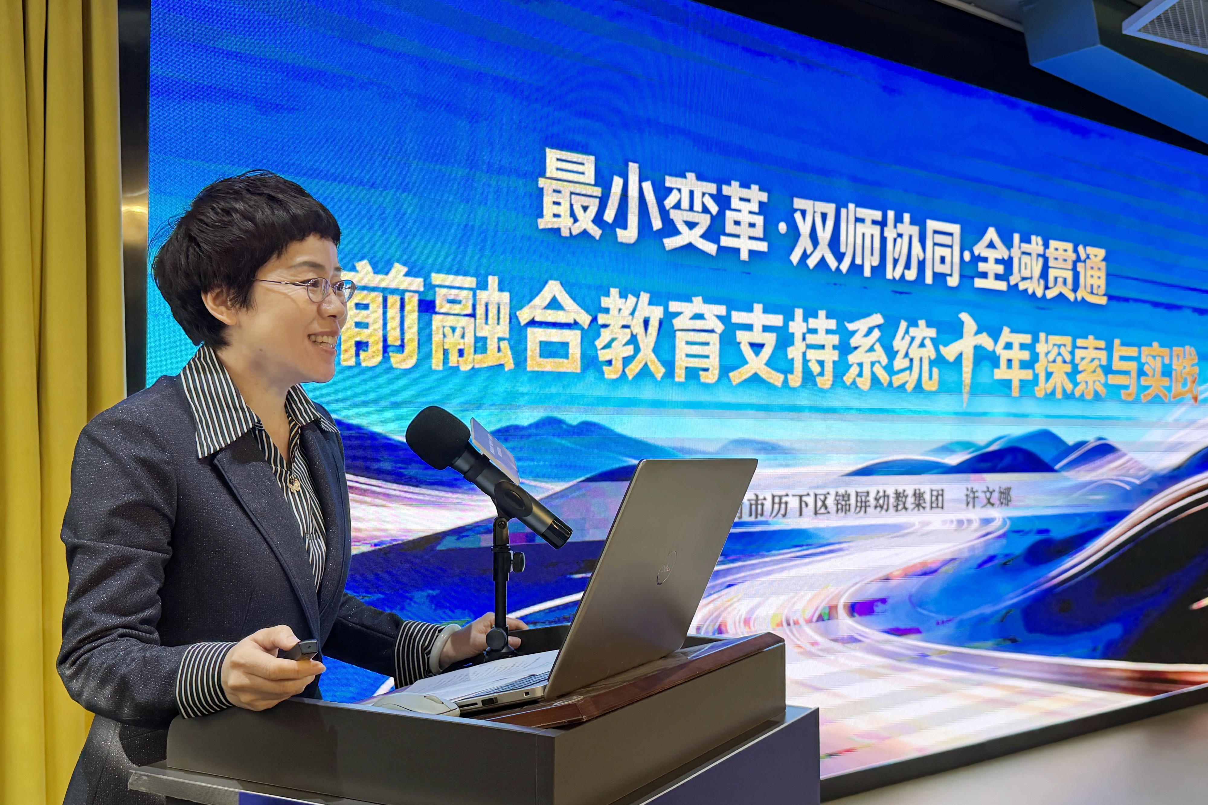 经验分享环节,锦屏幼教集团总园长许文娜以《最小变革·双师协同·全域贯通:学前融合教育支持系统十年探索与实践》为题,系统介绍集团十年融合教育实践成果:通过优化组织架构、打造教师与康复师双师队伍、精准适配课程满足个性化需求、构建家园社协同育人闭环等多路径探索,形成本土化、可落地的融合教育支持体系,得到与会领导专家高度赞誉。