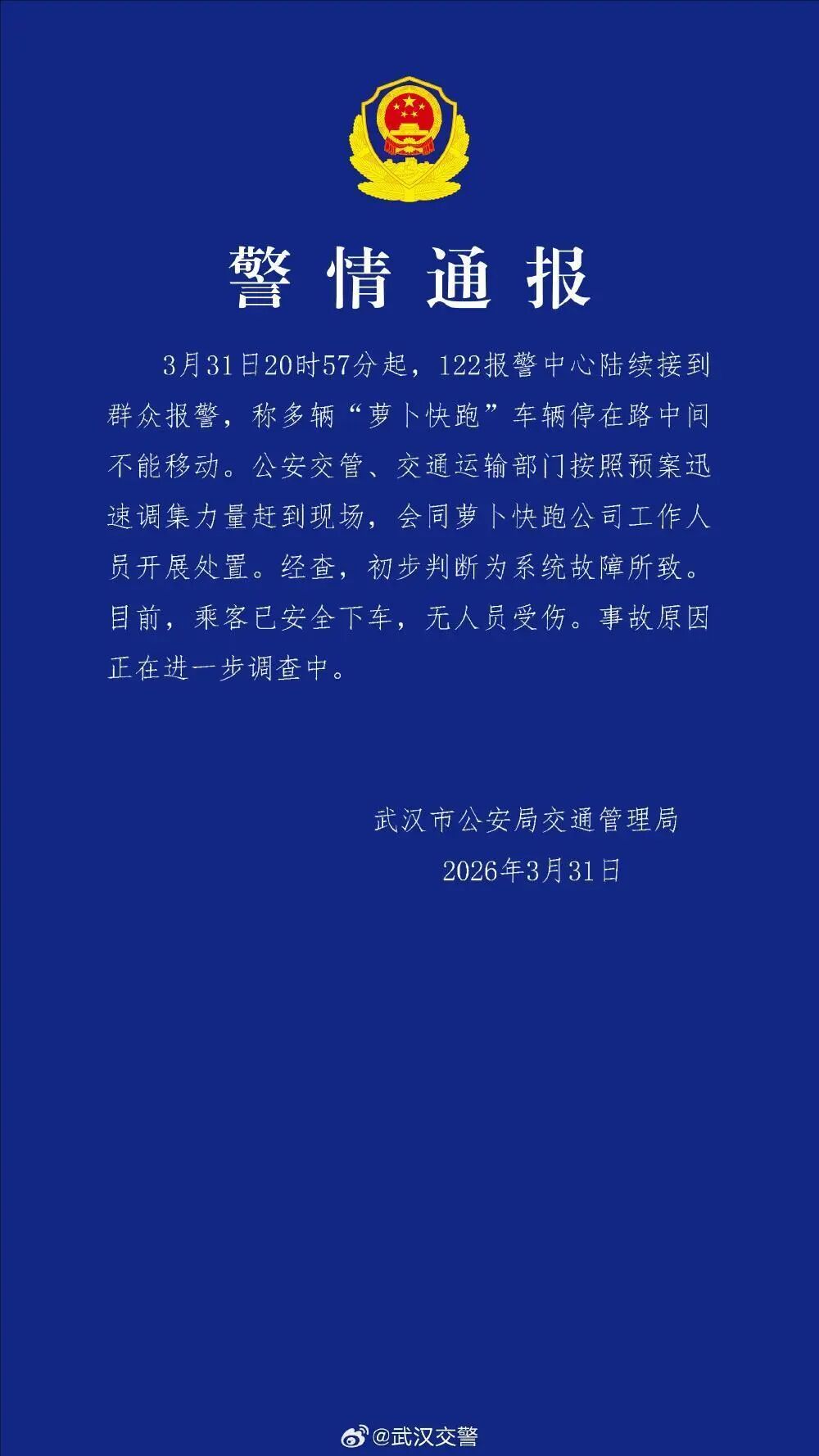 武汉交警通报“多辆‘萝卜快跑’行驶中突然停车”综合新闻 | 2026-04-01 21:01:14 微信扫码扫码下载客户端3月31日晚,湖北武汉多辆“萝卜快跑”在行驶过程中突然“停摆”。武汉交警通报称:初步判断为系统故障,无人员伤亡,事故原因进一步调查中。责任编辑:李金蔚