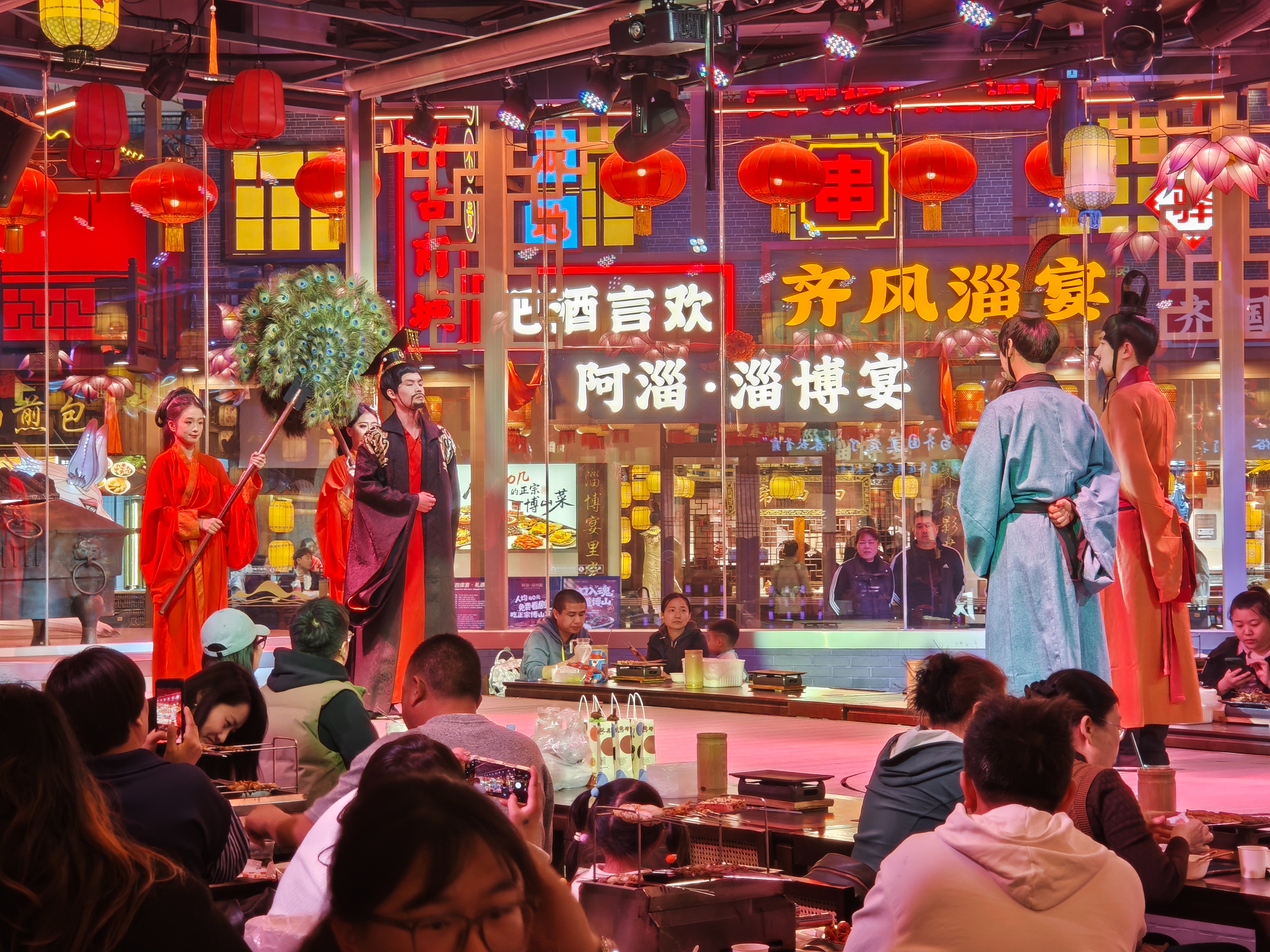 “如今在淄博,吃的不只是烧烤,更是体验一场文化之旅。” 阿淄烧烤负责人郑峰的话道出了淄博文旅发展的核心逻辑。郑峰介绍,经过三年的迭代发展,阿淄烧烤从单纯的餐饮消费升级为沉浸式烧烤体验,通过“烧烤+演绎”的创新模式,将姜子牙、颜文姜、蒲松龄等历史人物与地域文化融入舞台剧中,让游客在品味烟火气的同时,触摸淄博的文化底蕴。