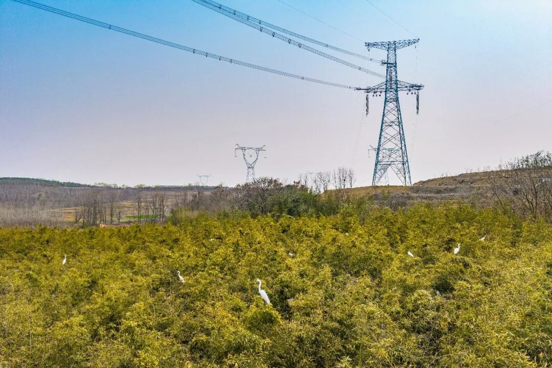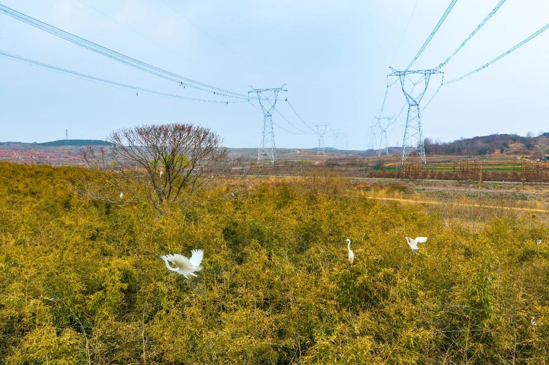 ▲白鹭在烟威特高压线路工程日照段沿线栖息,鸟类与架线施工和谐共融