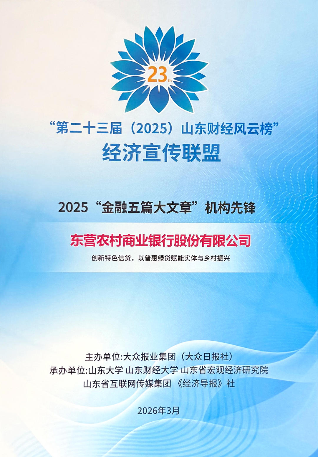 3月27日,由大众报业集团(大众日报社)主办,山东大学、山东财经大学、山东省宏观经济研究院、山东省互联网传媒集团、《经济导报》社等单位共同承办的“第二十三届(2025)山东财经风云榜经济宣传交流会”在济南举行。东营农商银行凭借在创新特色信贷赋能实体经济与乡村振兴方面的突出贡献获评“2025‘金融五篇大文章’机构先锋”。