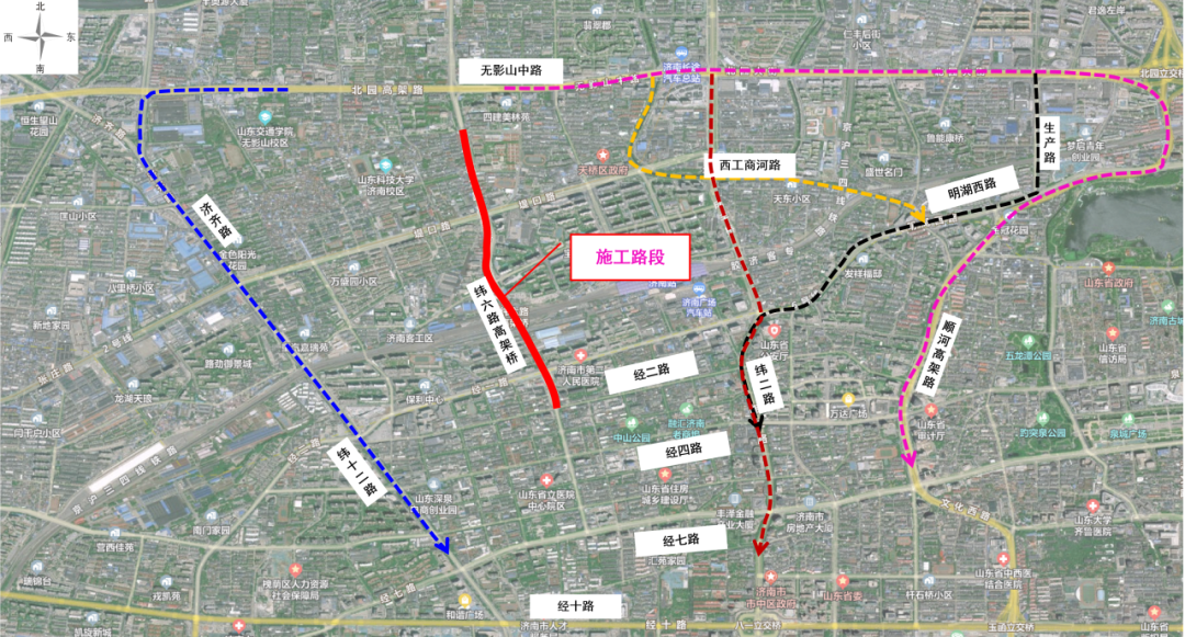 纬六路高架桥于1999年开工建设,2004年建成通车,全长约2700米,南起经二路,北至无影山南路,紧邻济南站,是衔接城区交通、疏导区域车流的重要走廊。