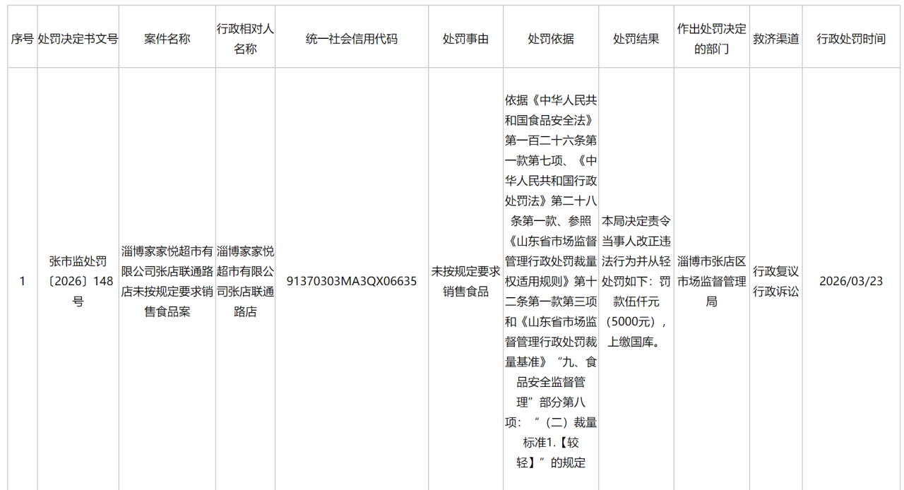 公示信息显示,淄博家家悦超市有限公司张店联通路店因未按规定要求销售食品,依据《中华人民共和国食品安全法》第一百二十六条第一款第七项、《中华人民共和国行政处罚法》第二十八条第一款、参照《山东省市场监督管理行政处罚裁量权适用规则》第十二条第一款第三项和《山东省市场监督管理行政处罚裁量基准》“九、食品安全监督管理”部分第八项的规定,张店区市场监督管理局决定责令当事人改正违法行为并从轻处罚如下:罚款伍仟元(5000元),上缴国库。
