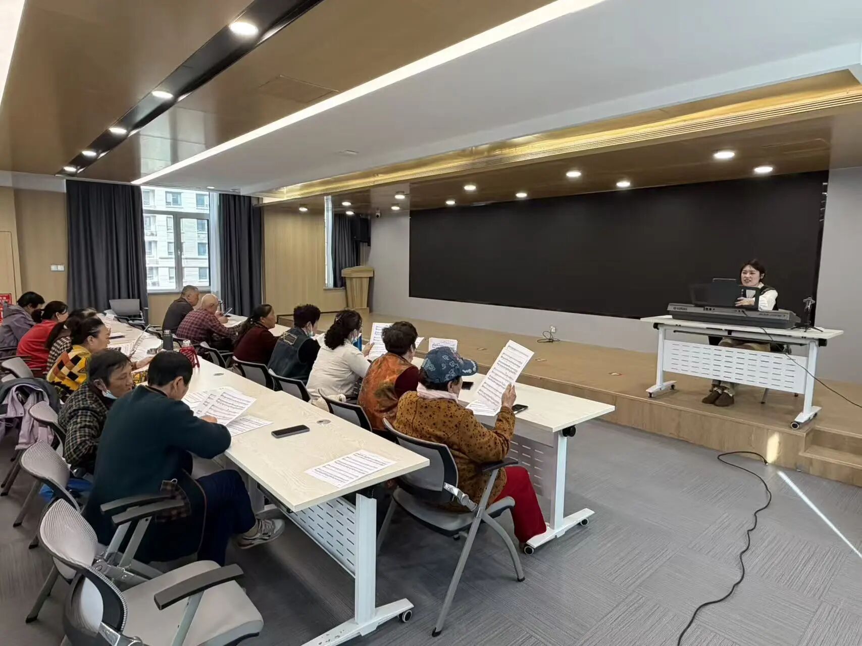 活动以“精准供给、普惠服务、以点带面”为核心,在辖区部分社区(村)站点有序开展美育公益、乡村技艺讲堂等多元文化服务,切实为基层群众送上“家门口”的高质量文化盛宴。活动启动以来,首批合唱公益培训课已在大桥街道鹊华理想社区率先开课。专业文艺师资团队紧扣群众学习需求,以生动有趣、通俗易懂的教学方式,从发声技巧、曲目选择、舞台表现等环节为学员进行指导。课堂上,合唱爱好者齐聚一堂,在悠扬的旋律中认真学习、反复练习,沉浸式感受合唱艺术的独特魅力。