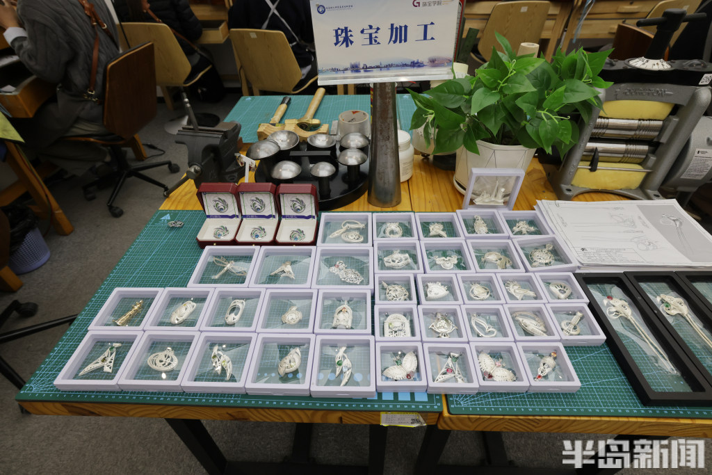 教室一旁的展示台、橱柜里,陈列着学生们亲手设计、制作的珠宝饰品,件件栩栩如生、工艺精良。
