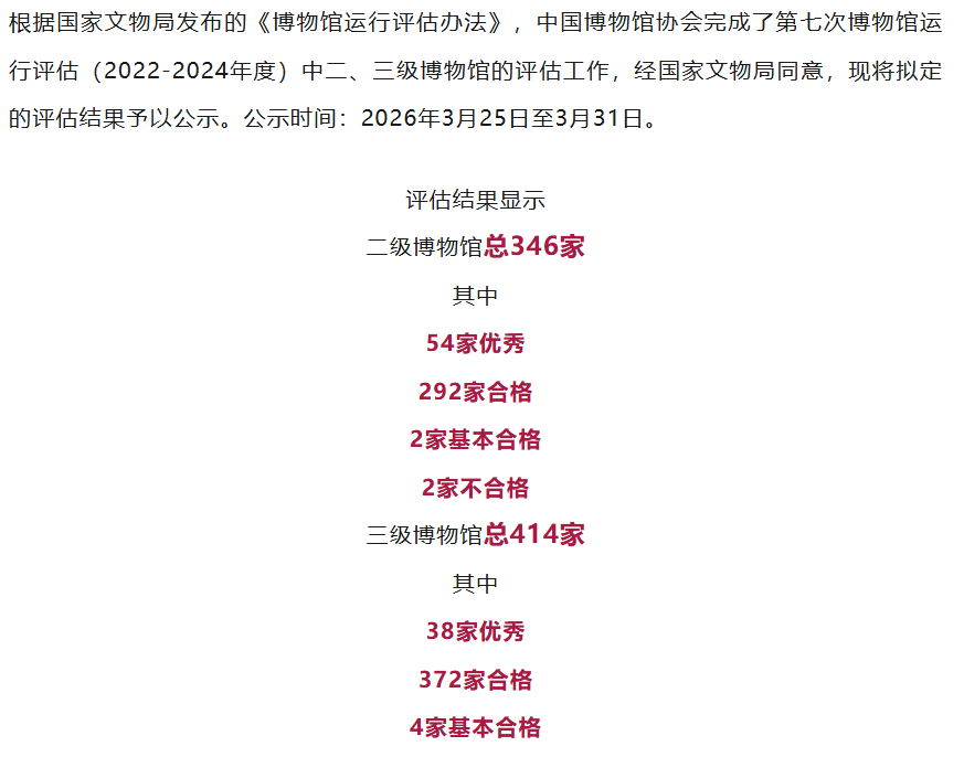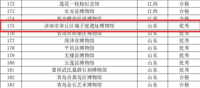 近日,中国博物馆协会公示760家二、三级博物馆运行评估结果,城子崖遗址博物馆在第七次博物馆运行评估(2022-2024年度)中,获评“优秀”等次。此次评估结果是对该馆过去三年工作的高度肯定,也是全体干部职工扎实工作的成果体现。