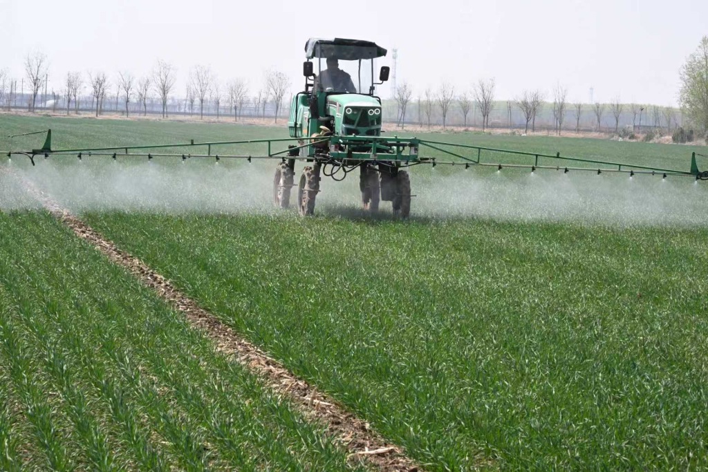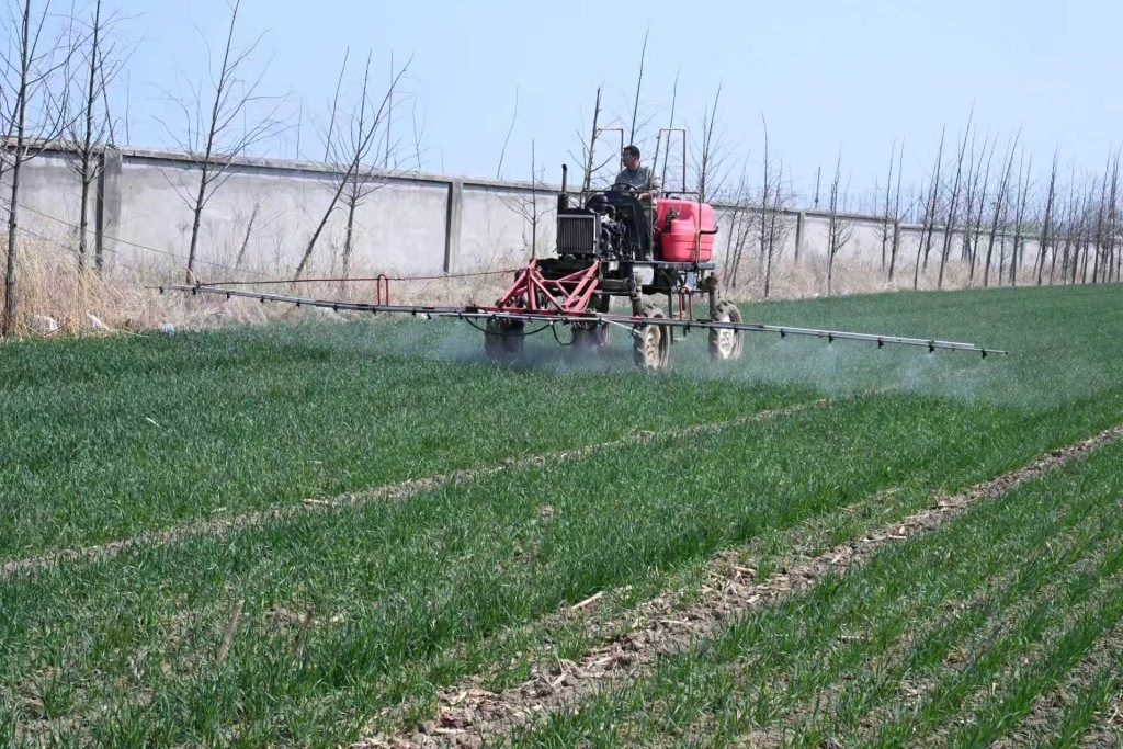 “现在,耕田有旋耕机,收割有收割机,打药有‘打药神器’,咱地里的‘科技范’今后会越来越足!”尹书智笑着说。他熟练操控喷雾机,在麦田中有序穿梭,喷头匀速喷洒配好的药剂,既实现病虫草害精准防控,又有效减少农药浪费。一小时可完成40到50亩小麦喷药任务,大幅提升春管进度,为抢抓农时提供坚实保障。