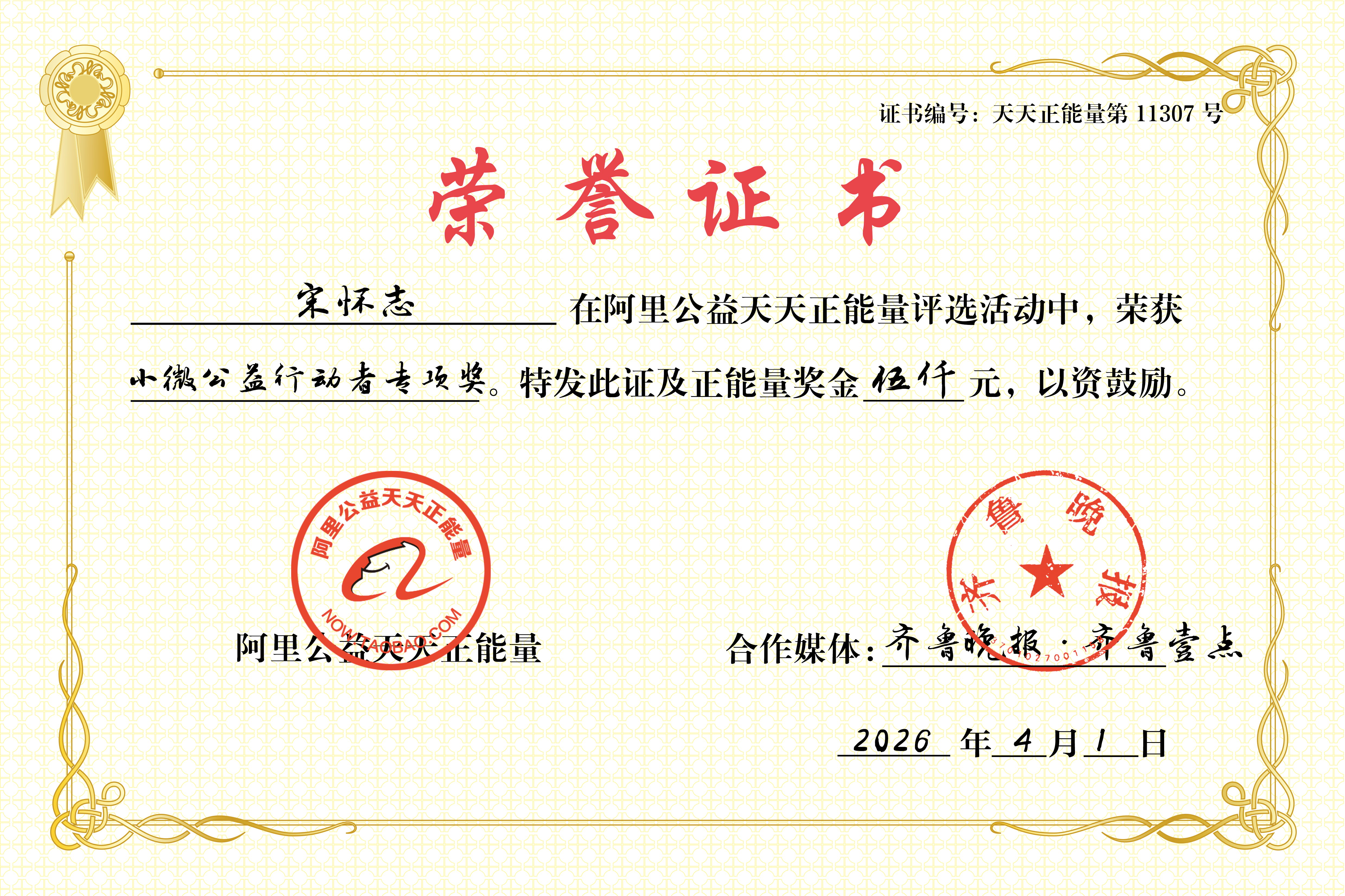 3月31日,齐鲁晚报・齐鲁壹点报道了济南市民宋怀志自发走上街头,义务清除路面遗留地钉、消除市民出行安全隐患一事。4月1日,济南义务 “拔钉人”宋怀志,获评阿里公益天天正能量小微公益行动者专项奖,奖金五千元。