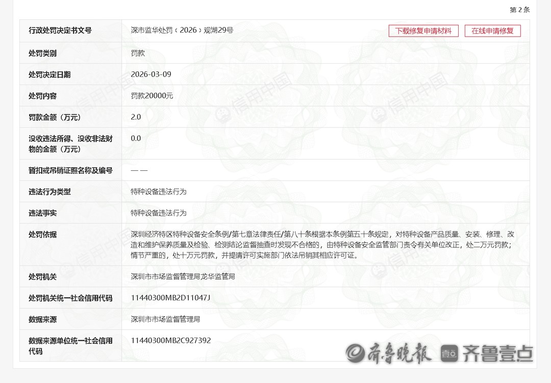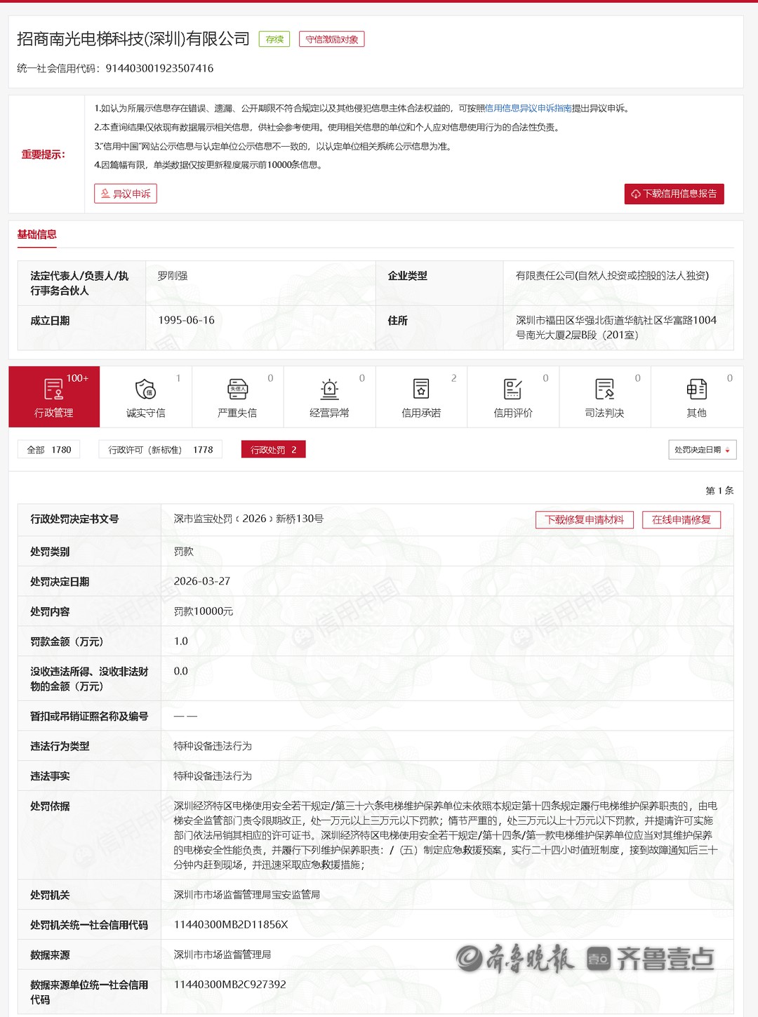 齐鲁晚报·齐鲁壹点记者从信用中国获悉,3月27日,招商南光电梯科技(深圳)有限公司因特种设备违法行为,被深圳市市场监督管理局宝安监管局罚款1万元。