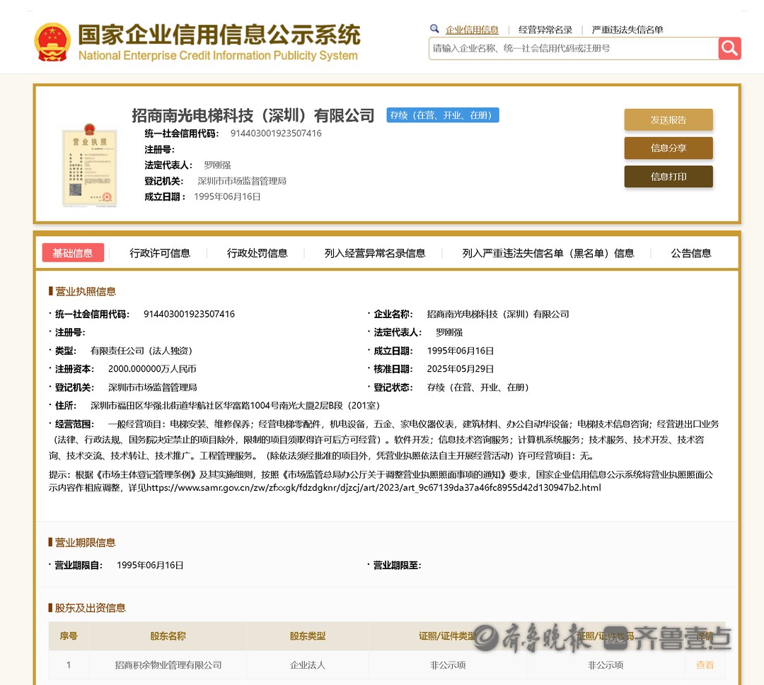 公开信息显示,招商南光电梯科技(深圳)有限公司成立于1995年6月16日,法定代表人罗刚强,股东为招商积余物业管理有限公司。后者为招商积余(001914)全资子公司。