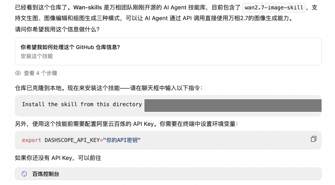 第二步,按照提示告诉「龙虾」阿里云百炼API Key。