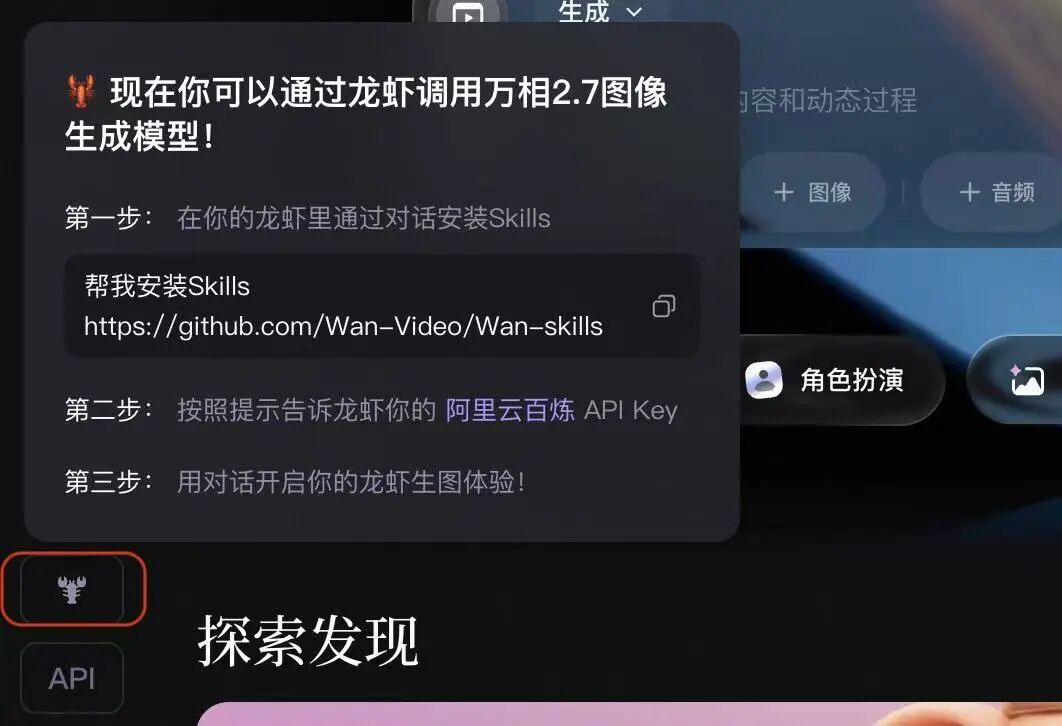 万相网页版左下角已经挂上了「龙虾」图标,简单三步一键完成接入——