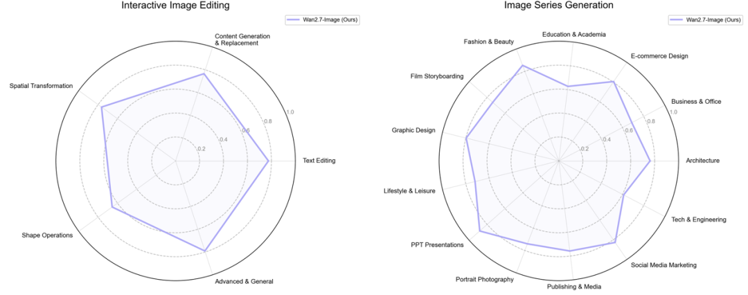 Wan2.7-Image支持交互式编辑(文字编辑、空间变换、内容生成和替换),多图像生成能力覆盖时尚美容、平面设计等多领域,堪称六边形战士。