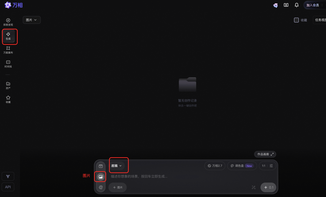 第一步,在图片生成页面,底部工具栏将模式切换为「底稿」,上传要编辑的原图。