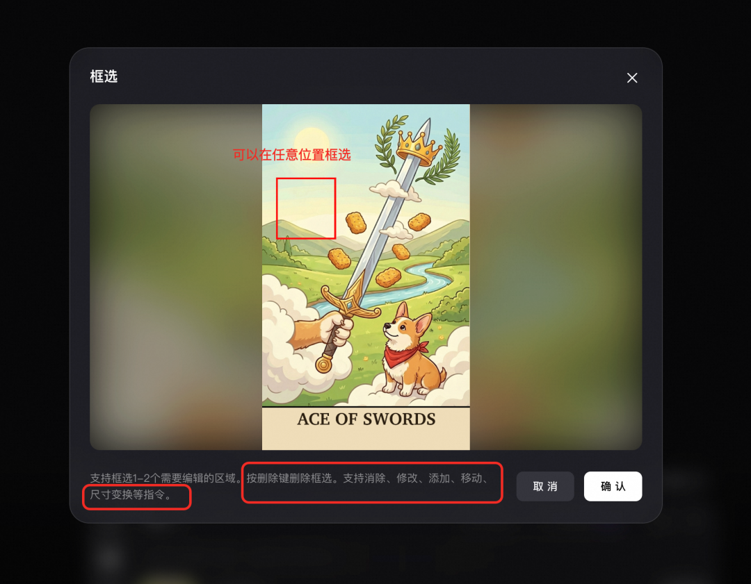 第三步,在图上拖出一个矩形框,圈住你要编辑的区域(支持框选1-2个区域)。支持消除、修改、添加、移动、尺寸变换等操作,确认后回到主界面。