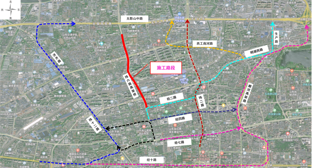 施工期间北向南车辆绕行路径示意图记者获悉,大修完成后,纬六路高架桥将实现结构安全、配套设施、通行体验的全面升级,既能有效分流区域车流,为西部城区发展筑牢交通支撑,更让广大市民享受到更平顺、更安全、更舒心的出行体验。