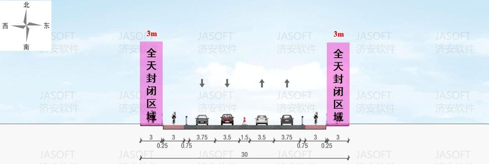 本次施工共分为三个阶段,其中,4月7日-7月23日为第一阶段,全天封闭人行道施工(堤口路-经二路),机动车、非机动车正常通行。
