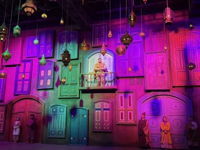 走入乐魂剧场,就来到了《遇见喀什》的传统剧场观看部分,也是核心点——中国新疆维吾尔木卡姆艺术的保护传承之路。接连有百余位演员以“歌舞剧融合情景剧”的方式,讲述了明代音乐家、诗人阿曼尼莎汗整理《十二木卡姆》,将170多首歌曲舞曲、70多首器乐间奏曲成套化、定型化的故事,以及20世纪50年代人民音乐家万桐书携家眷从北京到新疆,抢救性记录濒临失传的十二木卡姆的传奇故事,让观众深入了解中华文化传承之路的艰辛历程。