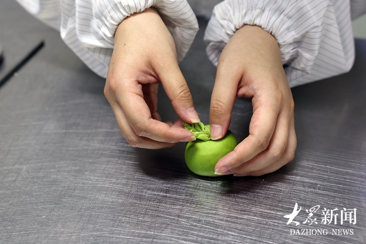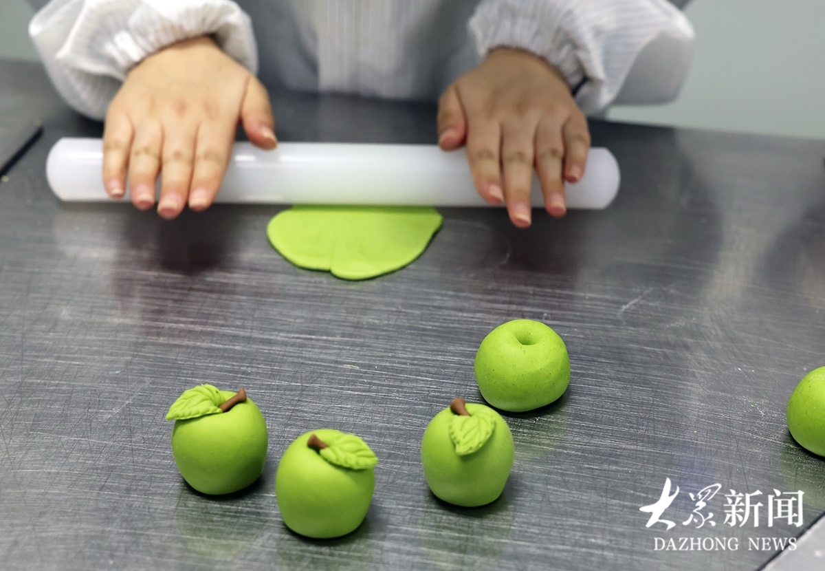 当地还推出花饽饽手工制作研学体验项目,记者实地参与体验,在专业师傅的指导下,亲手制作出苹果造型的花饽饽。
