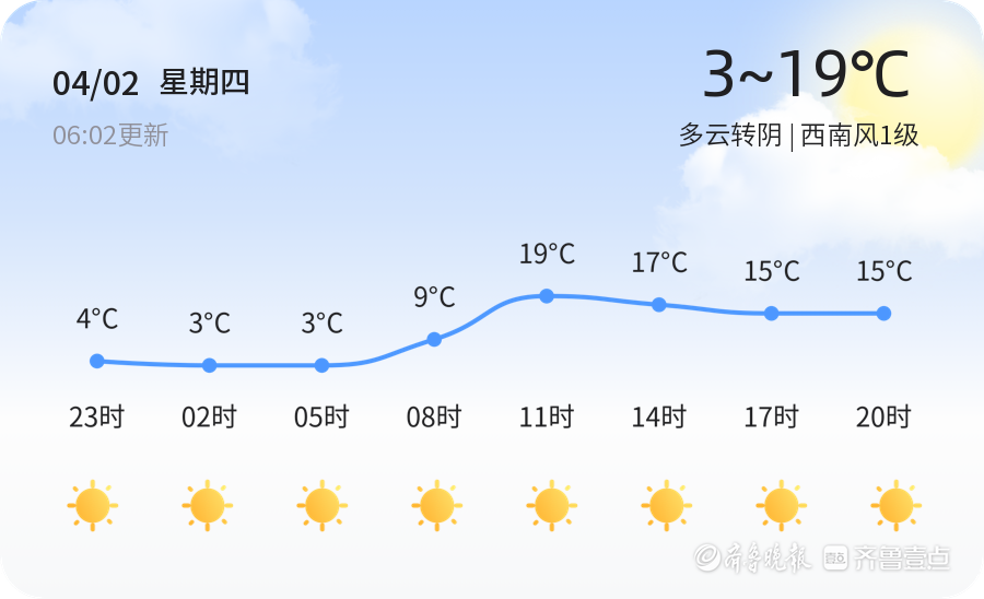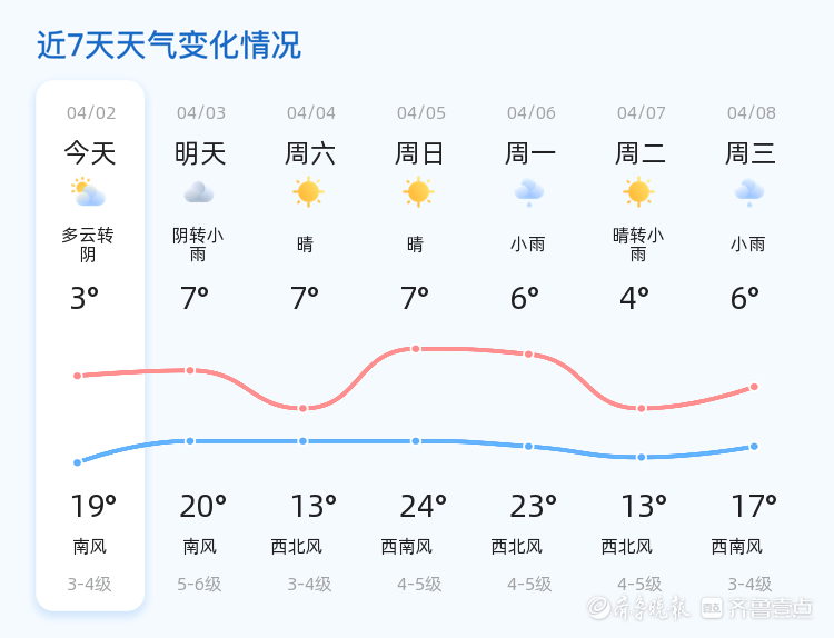 今天是4月2日,星期四,农历二月十五。烟台市迎来多云转阴的天气,气温在3℃到19℃之间,西南风1级,空气湿度为52%。各区天气情况总体平稳,但风力较大,市民出行请注意防风保暖。当前温度为7.2℃,空气质量指数为105,建议敏感人群减少户外活动。