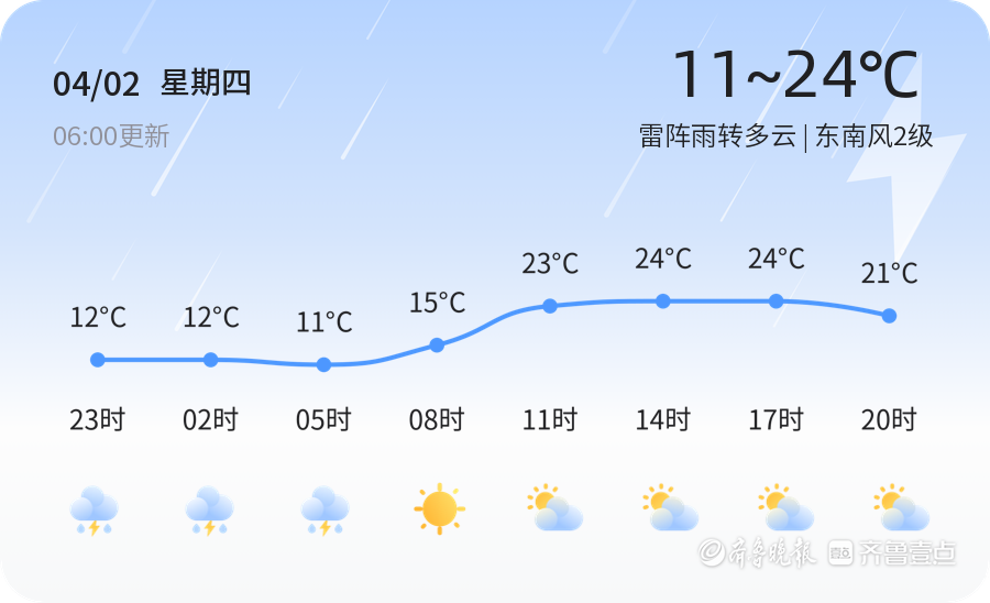 今天是4月2日,星期四,农历二月十五。济南市气象台今日凌晨发布雷电黄色预警信号。目前济南市部分地区已出现雷电活动,预计今天夜间到明天早晨全市仍将出现分散性雷阵雨天气,局部地区伴有7~8级的雷雨阵风,可能会造成雷电灾害,请注意防范!