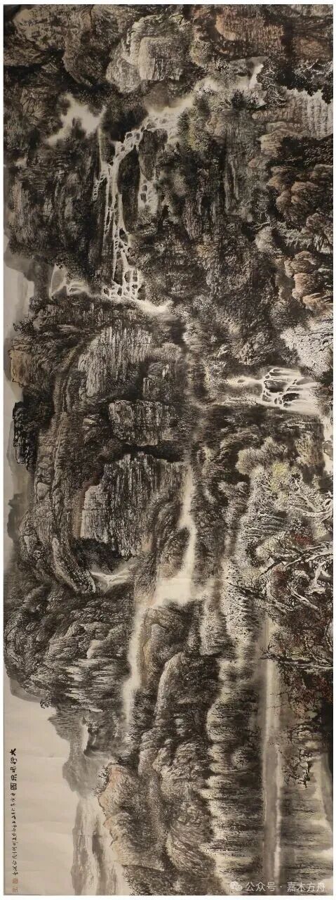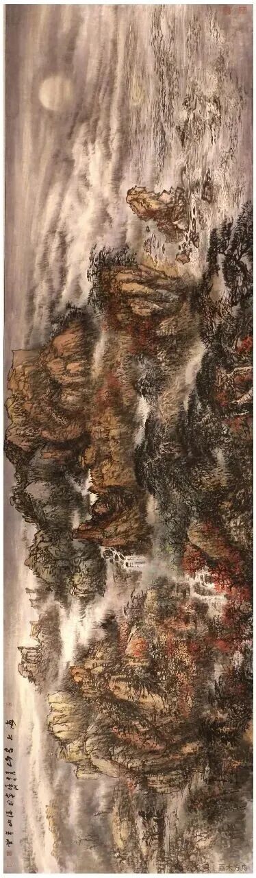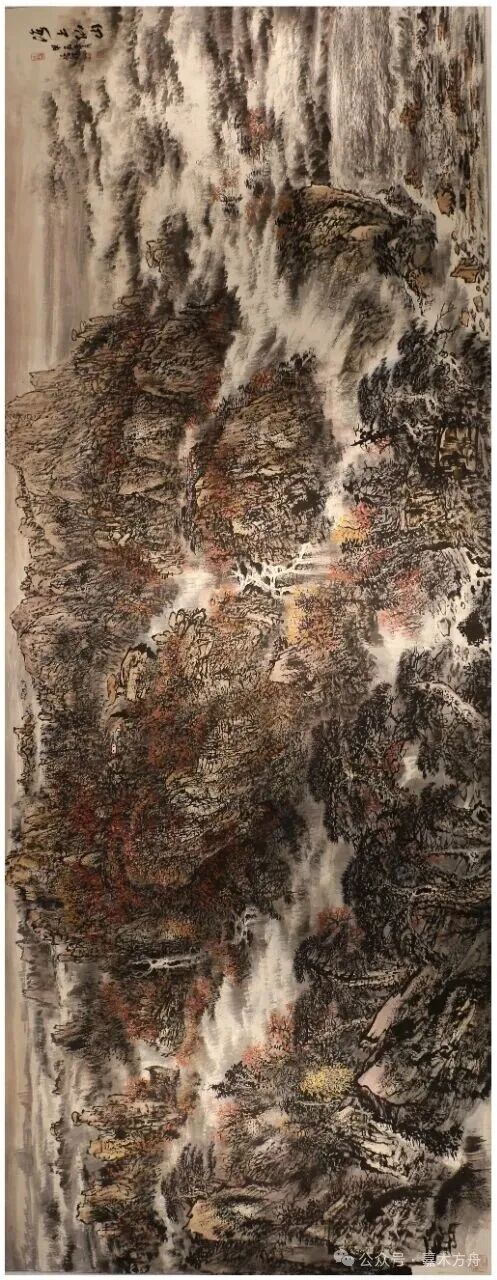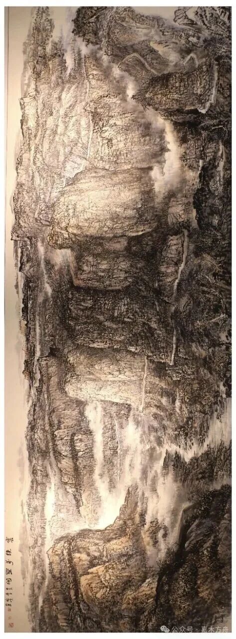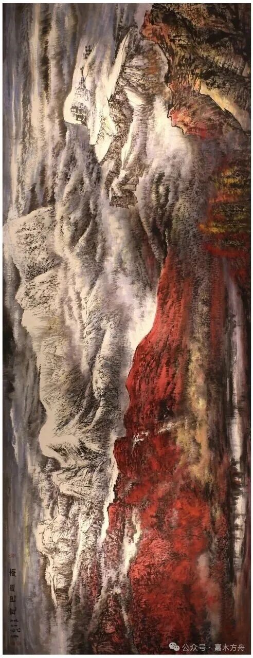 构成的“野性张力”与“心理空间”。苏兆洪钟爱巨幅创作,这固然承袭了北宋山水的“大境”传统。然而,其画面的内部构成,却充满了 “古典秩序与现代心象的剧烈张力”。宏观上,他常采用高远、深远结合的全景式构图,主峰巍峨,气势撼人,维持着宏大的视觉结构。深入画面细节,则会发现诸多“非理性”的空间处理:前景的巨石常以极具压迫感的特写方式突兀耸立,几乎冲破画面边界;中景的云海并非轻柔的衬托,而是如漩涡般涌动,具有吞噬性的动感;山径、流泉、屋舍的布置,并非完全遵循“可游可居”的物理逻辑,更像是由情绪流与视觉节奏所引导的“心理路径”。这种构图方式,使得他的山水不再是宋人笔下那种静观、和谐、可供精神栖居的宇宙秩序图景,而更似一个灌注了现代个体强烈生命体验、情感波动与视觉冲动的 “心理景观”。古典的宏大框架,被苏兆洪填入了野性的、个人化的、充满张力的内容。