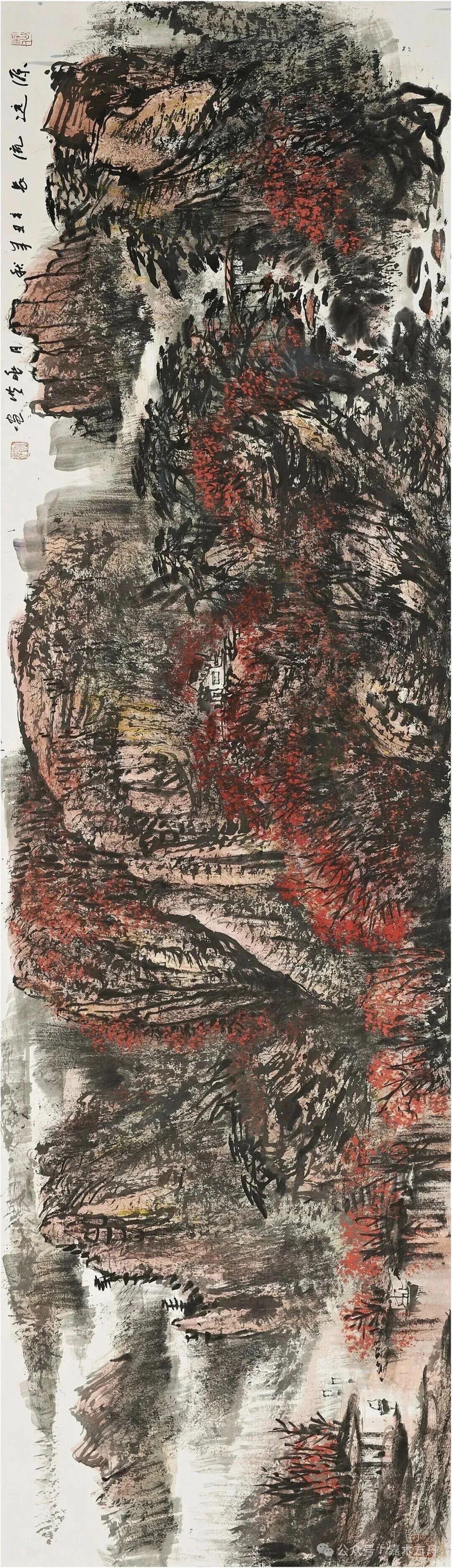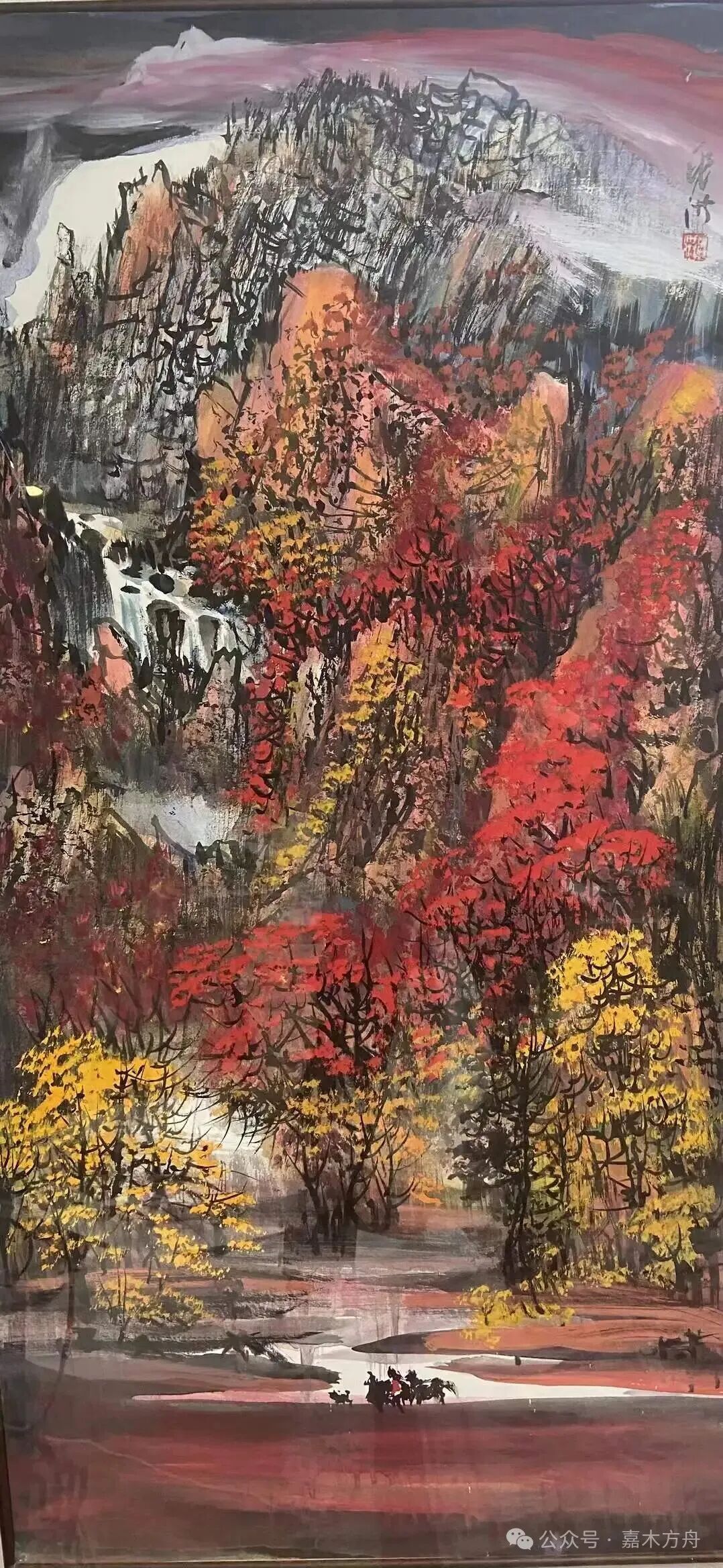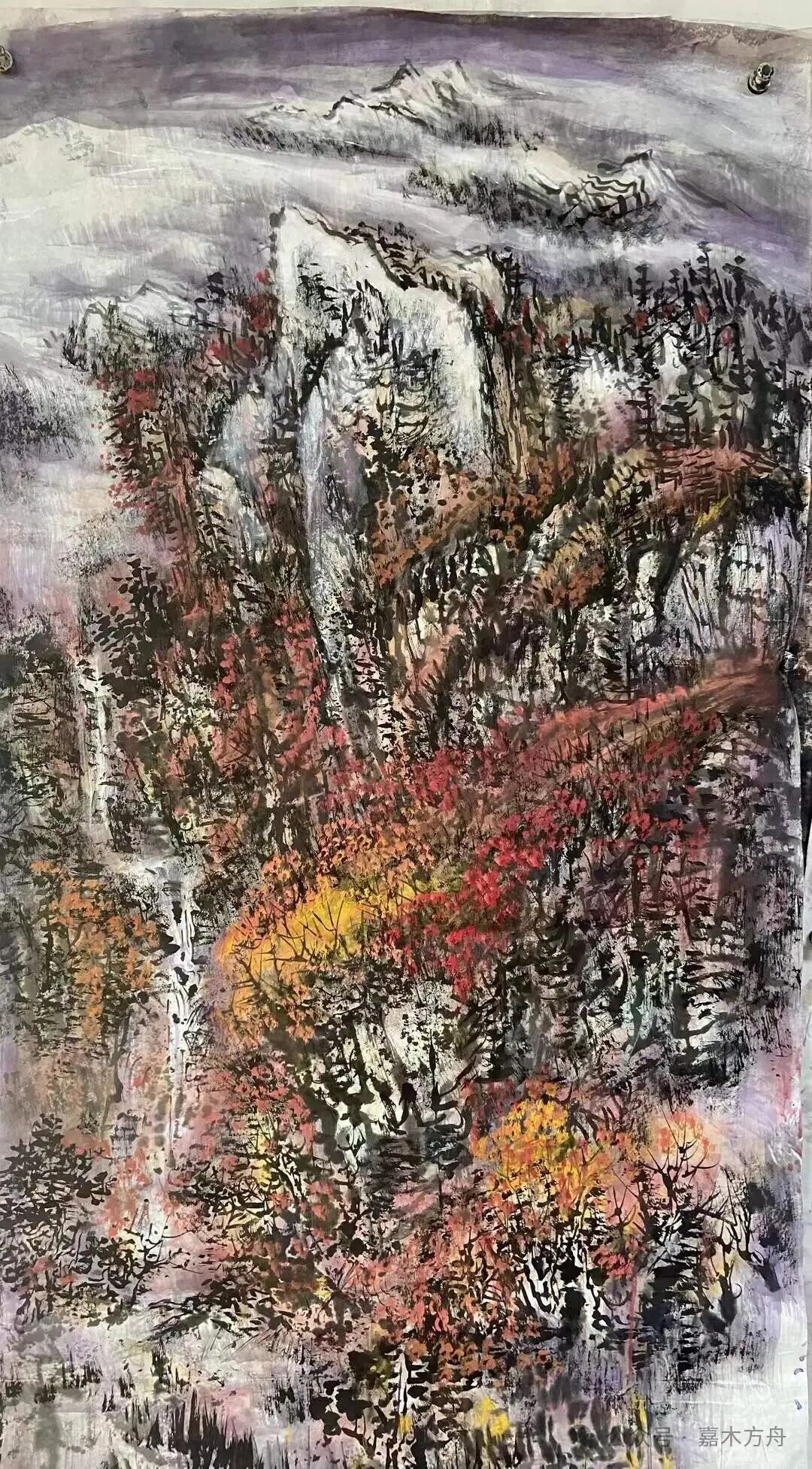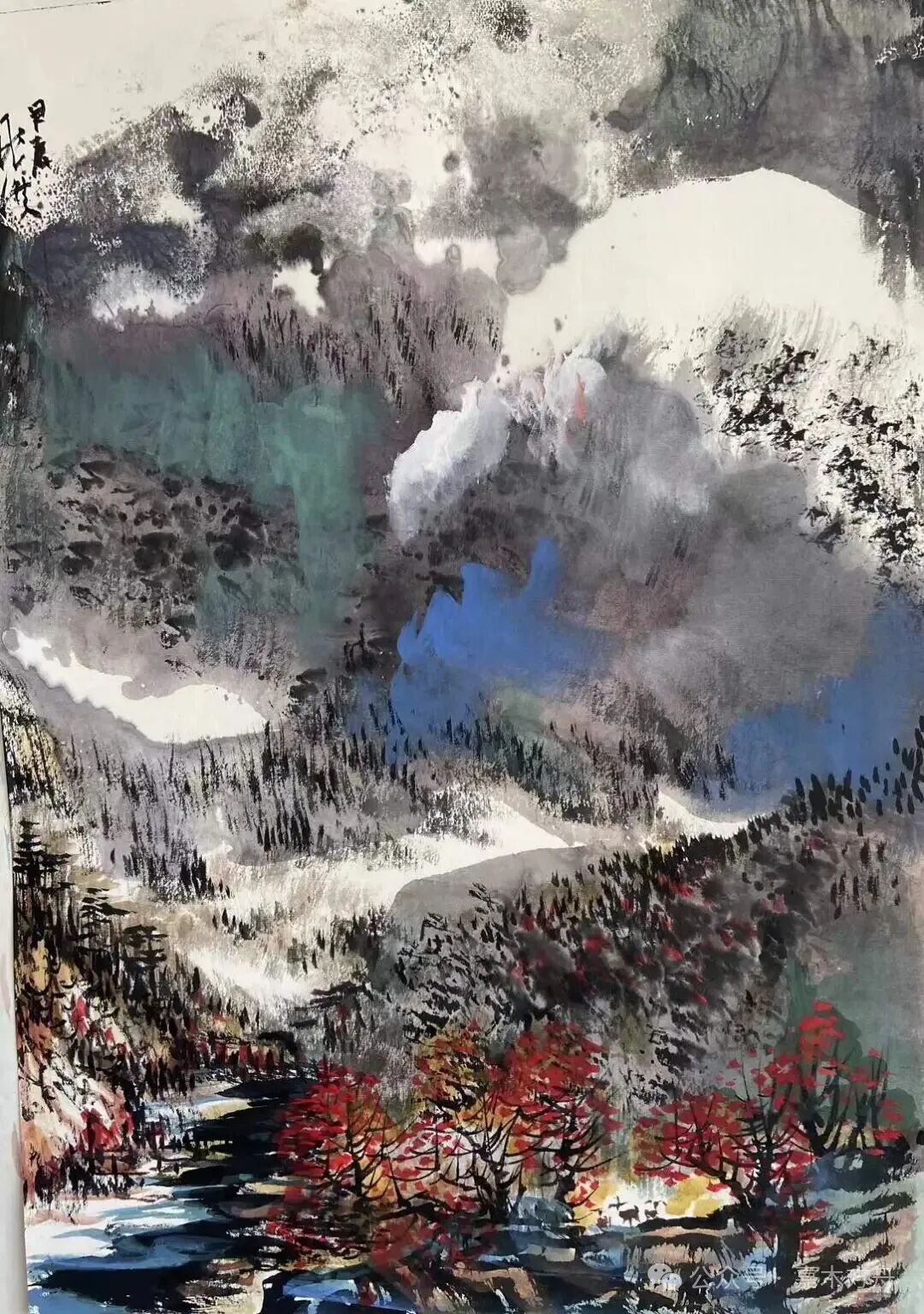 色彩的“野逸生机”与“情感投射”。在色彩语言上,苏兆洪同样表现出“非驯化”的特质。他在青绿、浅绛等传统山水色调体系的基础上,大胆地、甚至有些“鲁莽”地点缀以醒目的朱砂、石黄、石膏,并擅长运用泼彩、冲染等手法,使色彩自然流淌、沉淀、交融,形成斑驳陆离的偶然肌理。这种色彩运用,隐约可见张大千晚年泼彩的抽象意趣,但褪去了其“化”的娴雅,增添了北地画风的强烈与直接。它首先是对自然本身绚丽色彩(如秋山红叶、夕照辉光)的直率回应,更是内心激越情感的直接投射与外化。色彩在苏兆洪这里,不再是依附于物象的“随类赋彩”,而是独立的、具有表现力的 “情感书写” 元素。它从文人画“水墨为上”的雅致规范中逸出,隐约接通了民间艺术的浓烈、宗教壁画的沉厚,为画面注入了来自土地与生命的、原始而野逸的蓬勃生机。