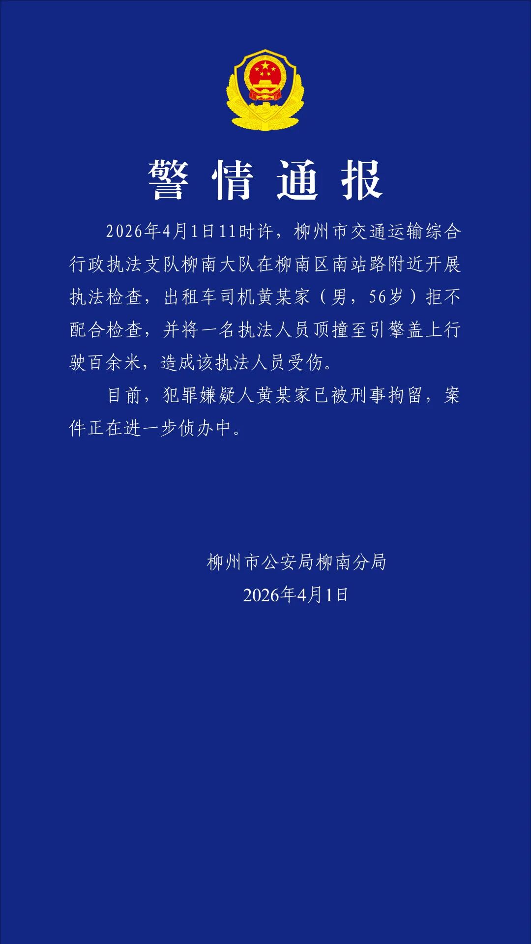 柳州警方:司机将执法人员顶撞至引擎盖上行驶百余米,已被刑拘“柳州警方”微信公号 2026-04-01 22:56:514月1日,柳州市公安局柳南分局发布警情通报: (“柳州警方”微信公号)责任编辑:袁野
