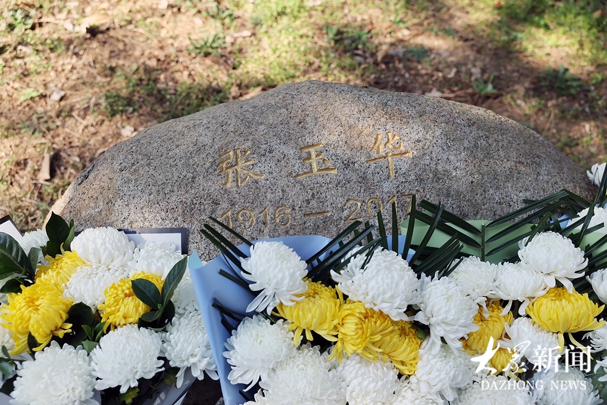 张玉华将军墓地极为简朴,仅一块圆石,石上刻有将军与爱人的姓名、生卒年份。按将军生前遗愿,骨灰撒在家乡文登、天福山革命遗址内,不办仪式、不立墓碑。这块圆石,是当地群众自发摆放纪念,石料取自当地海拔最高的昆嵛山。
