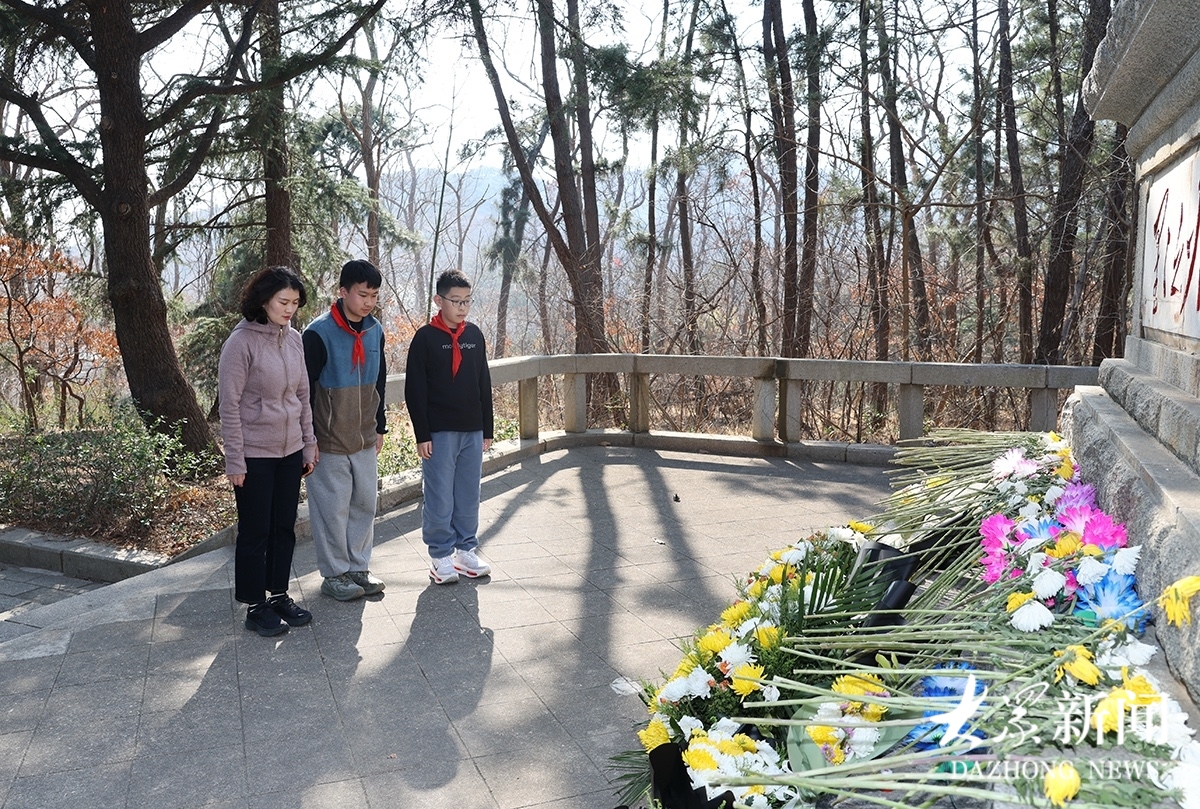 4月1日,威海市文登区天福山革命遗址,开国将军张玉华墓前,其外孙女郭然带着晚辈鞠躬、敬献花束,深切祭奠。