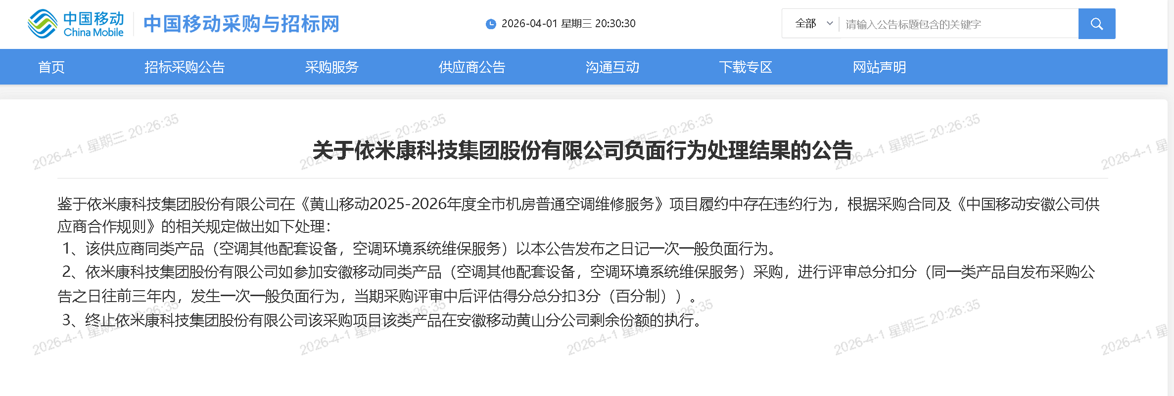 鉴于依米康在《黄山移动2025-2026年度全市机房普通空调维修服务》项目履约中存在违约行为,根据采购合同及《中国移动安徽公司供应商合作规则》的相关规定做出如下处理: