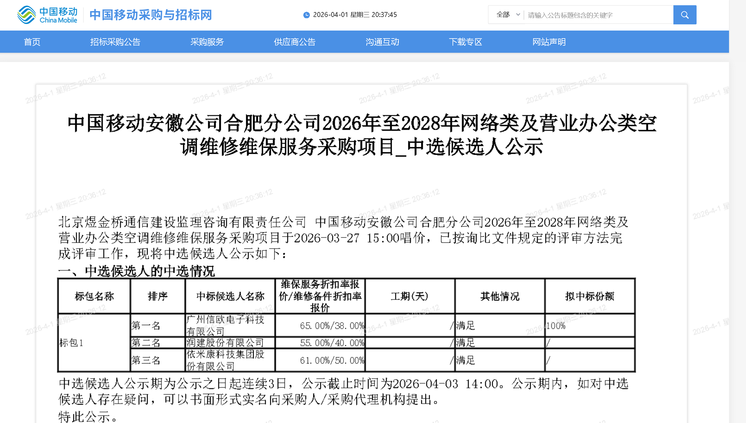 3月31日,中国移动采购与招标网发布中国移动安徽公司合肥分公司2026年至2028年网络类及营业办公类空调维修维保服务采购项目中选候选人公示,依米康排在第三位,未能中标。
